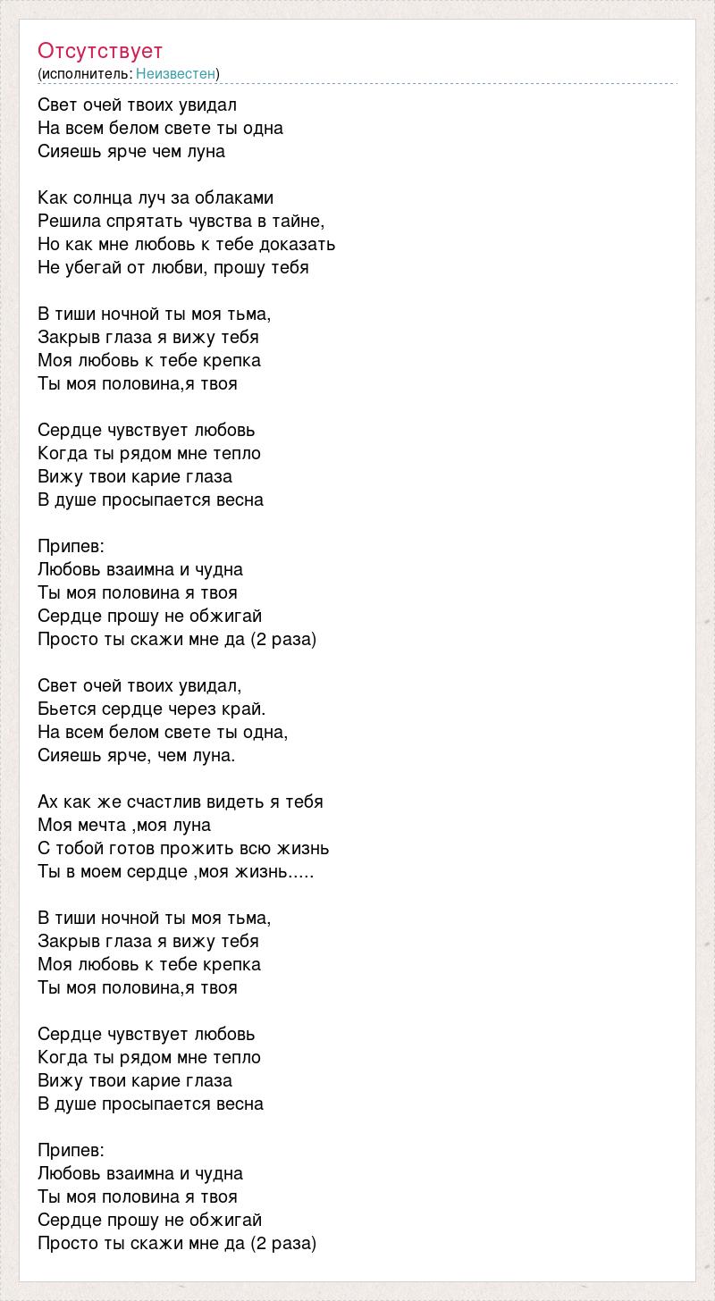 Свет очей твоих увидал На всем белом свете ты одна Сияешь ярче чем луна Как солнца луч за облаками Решила спрятать чувства в тайне, Но как мне любовь к тебе доказать Не убегай от любви, прошу тебя В тиши ночной ты моя тьма, Закрыв глаза я вижу тебя Моя любовь к тебе крепка Ты моя половина,я твоя Сердце чувствует любовь Когда ты рядом мне тепло Вижу твои карие глаза В душе просыпается весна Припев: Любовь взаимна и чудна Ты моя половина я твоя Сердце прошу не обжигай Просто ты скажи мне да (2 раза) Свет очей твоих увидал, Бьется сердце через край. На всем белом свете ты одна, Сияешь ярче, чем луна. Ах как же счастлив видеть я тебя Моя мечта ,моя луна С тобой готов прожить всю жизнь Ты в моем сердце ,моя жизнь..... В тиши ночной ты моя тьма, Закрыв глаза я вижу тебя Моя любовь к тебе крепка Ты моя половина,я твоя Сердце чувствует любовь Когда ты рядом мне тепло Вижу твои карие глаза В душе просыпается весна Припев: Любовь взаимна и чудна Ты моя половина я твоя Сердце прошу не обжигай Просто ты скажи мне да (2 раза)
