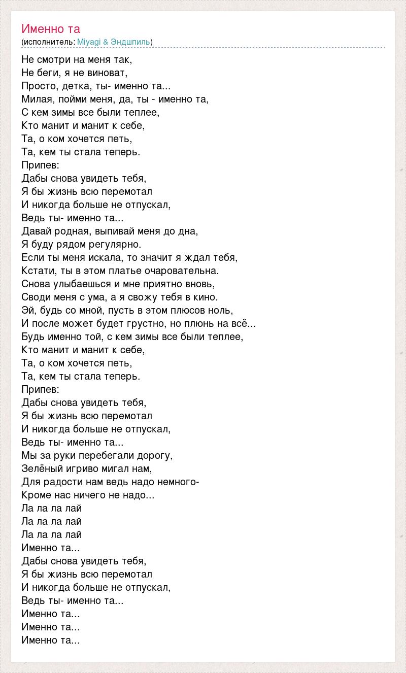 Не смотри на меня так, Не беги, я не виноват, Просто, детка, ты- именно та... Милая, пойми меня, да, ты - именно та, С кем зимы все были теплее, Кто манит и манит к себе, Та, о ком хочется петь, Та, кем ты стала теперь. Припев: Дабы снова увидеть тебя, Я бы жизнь всю перемотал И никогда больше не отпускал, Ведь ты- именно та... Давай родная, выпивай меня до дна, Я буду рядом регулярно. Если ты меня искала, то значит я ждал тебя, Кстати, ты в этом платье очаровательна. Снова улыбаешься и мне приятно вновь, Своди меня с ума, а я свожу тебя в кино. Эй, будь со мной, пусть в этом плюсов ноль, И после может будет грустно, но плюнь на всё... Будь именно той, с кем зимы все были теплее, Кто манит и манит к себе, Та, о ком хочется петь, Та, кем ты стала теперь. Припев: Дабы снова увидеть тебя, Я бы жизнь всю перемотал И никогда больше не отпускал, Ведь ты- именно та... Мы за руки перебегали дорогу, Зелёный игриво мигал нам, Для радости нам ведь надо немного- Кроме нас ничего не надо... Ла ла ла лай Ла ла ла лай Ла ла ла лай Именно та... Дабы снова увидеть тебя, Я бы жизнь всю перемотал И никогда больше не отпускал, Ведь ты- именно та... Именно та... Именно та... Именно та...