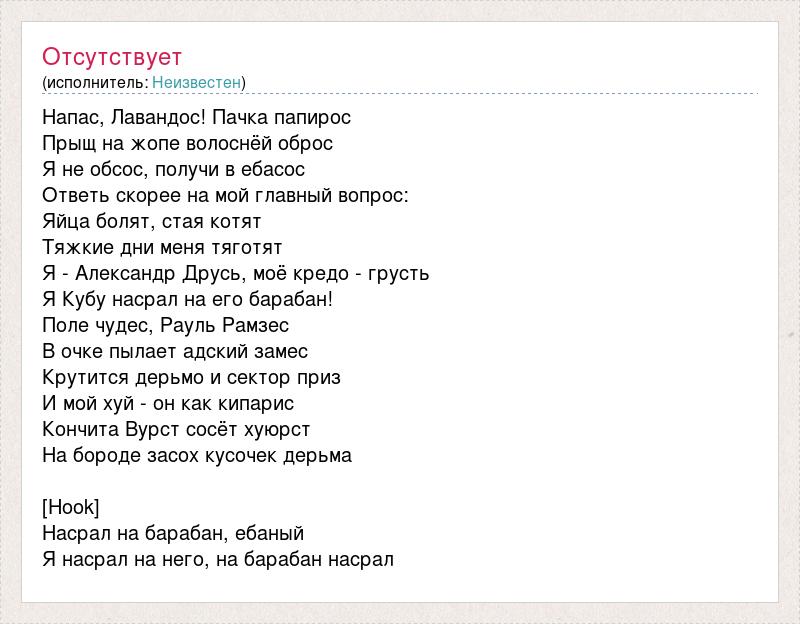 Напас, Лавандос! Пачка папирос Прыщ на жопе волоснёй оброс Я не обсос, получи в ебасос Ответь скорее на мой главный вопрос: Яйца болят, стая котят Тяжкие дни меня тяготят Я - Александр Друсь, моё кредо - грусть Я Кубу насрал на его барабан! Поле чудес, Рауль Рамзес В очке пылает адский замес Крутится дерьмо и сектор приз И мой хуй - он как кипарис Кончита Вурст сосёт хуюрст На бороде засох кусочек дерьма [Hook] Насрал на барабан, ебаный Я насрал на него, на барабан насрал