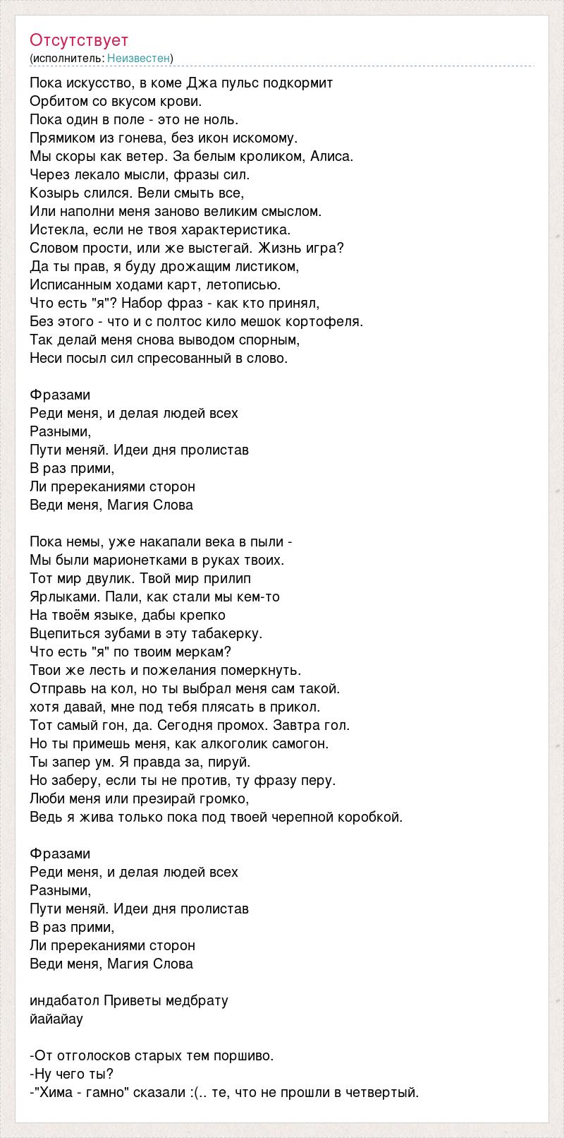 Пока искусство, в коме Джа пульс подкормит Орбитом со вкусом крови. Пока один в поле - это не ноль. Прямиком из гонева, без икон искомому. Мы скоры как ветер. За белым кроликом, Алиса. Через лекало мысли, фразы сил. Козырь слился. Вели смыть все, Или наполни меня заново великим смыслом. Истекла, если не твоя характеристика. Словом прости, или же выстегай. Жизнь игра? Да ты прав, я буду дрожащим листиком, Исписанным ходами карт, летописью. Что есть "я"? Набор фраз - как кто принял, Без этого - что и с полтос кило мешок кортофеля. Так делай меня снова выводом спорным, Неси посыл сил спресованный в слово. Фразами Реди меня, и делая людей всех Разными, Пути меняй. Идеи дня пролистав В раз прими, Ли пререканиями сторон Веди меня, Магия Слова Пока немы, уже накапали века в пыли - Мы были марионетками в руках твоих. Тот мир двулик. Твой мир прилип Ярлыками. Пали, как стали мы кем-то На твоём языке, дабы крепко Вцепиться зубами в эту табакерку. Что есть "я" по твоим меркам? Твои же лесть и пожелания померкнуть. Отправь на кол, но ты выбрал меня сам такой. хотя давай, мне под тебя плясать в прикол. Тот самый гон, да. Сегодня промох. Завтра гол. Но ты примешь меня, как алкоголик самогон. Ты запер ум. Я правда за, пируй. Но заберу, если ты не против, ту фразу перу. Люби меня или презирай громко, Ведь я жива только пока под твоей черепной коробкой. Фразами Реди меня, и делая людей всех Разными, Пути меняй. Идеи дня пролистав В раз прими, Ли пререканиями сторон Веди меня, Магия Слова индабатол Приветы медбрату йайайау -От отголосков старых тем поршиво. -Ну чего ты? -"Хима - гамно" сказали :(.. те, что не прошли в четвертый.