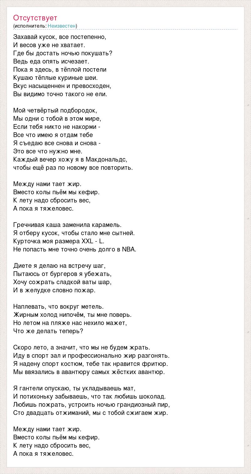 Захавай кусок, все постепенно, И весов уже не хватает. Где бы достать ночью покушать? Ведь еда опять исчезает. Пока я здесь, в тёплой постели Кушаю тёплые куриные шеи. Вкус насыщеннен и превосходен, Вы видимо точно такого не ели. Мой четвёртый подбородок, Мы одни с тобой в этом мире, Если тебя никто не накорми - Все что имею я отдам тебе Я съедаю все снова и снова - Это все что нужно мне. Каждый вечер хожу я в Макдональдс, чтобы ещё раз по новому все повторить. Между нами тает жир. Вместо колы пьём мы кефир. К лету надо сбросить вес, А пока я тяжеловес. Гречнивая каша заменила карамель. Я отберу кусок, чтобы стало мне сытней. Курточка моя размера ХХL - L. Не попасть мне точно очень долго в NBA. Диете я делаю на встречу шаг, Пытаюсь от бургеров я убежать, Хочу сожрать сладкой ваты шар, И в желудке словно пожар. Наплевать, что вокруг метель. Жирным холод нипочём, ты мне поверь. Но летом на пляже нас нехило мажет, Что же делать теперь? Скоро лето, а значит, что мы не будем жрать. Иду в спорт зал и профессионально жир разгонять. Я надену спорт костюм, тебе так нравится фритюр. Мы ввязались в авантюру самых жёстких авантюр. Я гантели опускаю, ты укладываешь мат, И потихоньку забываешь, что так любишь шоколад. Любишь пожрать, устроить ночью грандиозный пир, Сто двадцать отжиманий, мы с тобой сжигаем жир. Между нами тает жир. Вместо колы пьём мы кефир. К лету надо сбросить вес, А пока я тяжеловес.