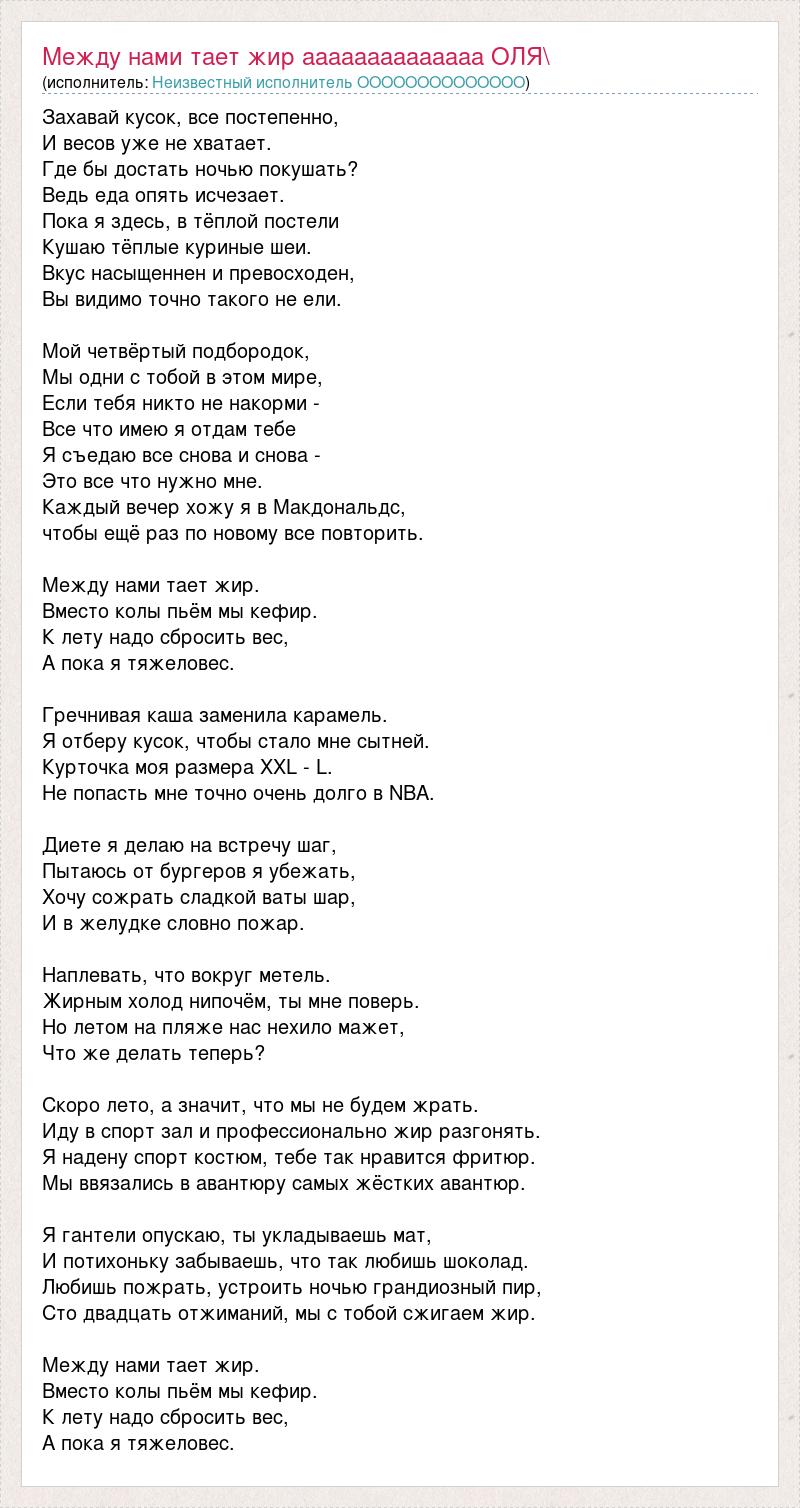 Захавай кусок, все постепенно, И весов уже не хватает. Где бы достать ночью покушать? Ведь еда опять исчезает. Пока я здесь, в тёплой постели Кушаю тёплые куриные шеи. Вкус насыщеннен и превосходен, Вы видимо точно такого не ели. Мой четвёртый подбородок, Мы одни с тобой в этом мире, Если тебя никто не накорми - Все что имею я отдам тебе Я съедаю все снова и снова - Это все что нужно мне. Каждый вечер хожу я в Макдональдс, чтобы ещё раз по новому все повторить. Между нами тает жир. Вместо колы пьём мы кефир. К лету надо сбросить вес, А пока я тяжеловес. Гречнивая каша заменила карамель. Я отберу кусок, чтобы стало мне сытней. Курточка моя размера ХХL - L. Не попасть мне точно очень долго в NBA. Диете я делаю на встречу шаг, Пытаюсь от бургеров я убежать, Хочу сожрать сладкой ваты шар, И в желудке словно пожар. Наплевать, что вокруг метель. Жирным холод нипочём, ты мне поверь. Но летом на пляже нас нехило мажет, Что же делать теперь? Скоро лето, а значит, что мы не будем жрать. Иду в спорт зал и профессионально жир разгонять. Я надену спорт костюм, тебе так нравится фритюр. Мы ввязались в авантюру самых жёстких авантюр. Я гантели опускаю, ты укладываешь мат, И потихоньку забываешь, что так любишь шоколад. Любишь пожрать, устроить ночью грандиозный пир, Сто двадцать отжиманий, мы с тобой сжигаем жир. Между нами тает жир. Вместо колы пьём мы кефир. К лету надо сбросить вес, А пока я тяжеловес.