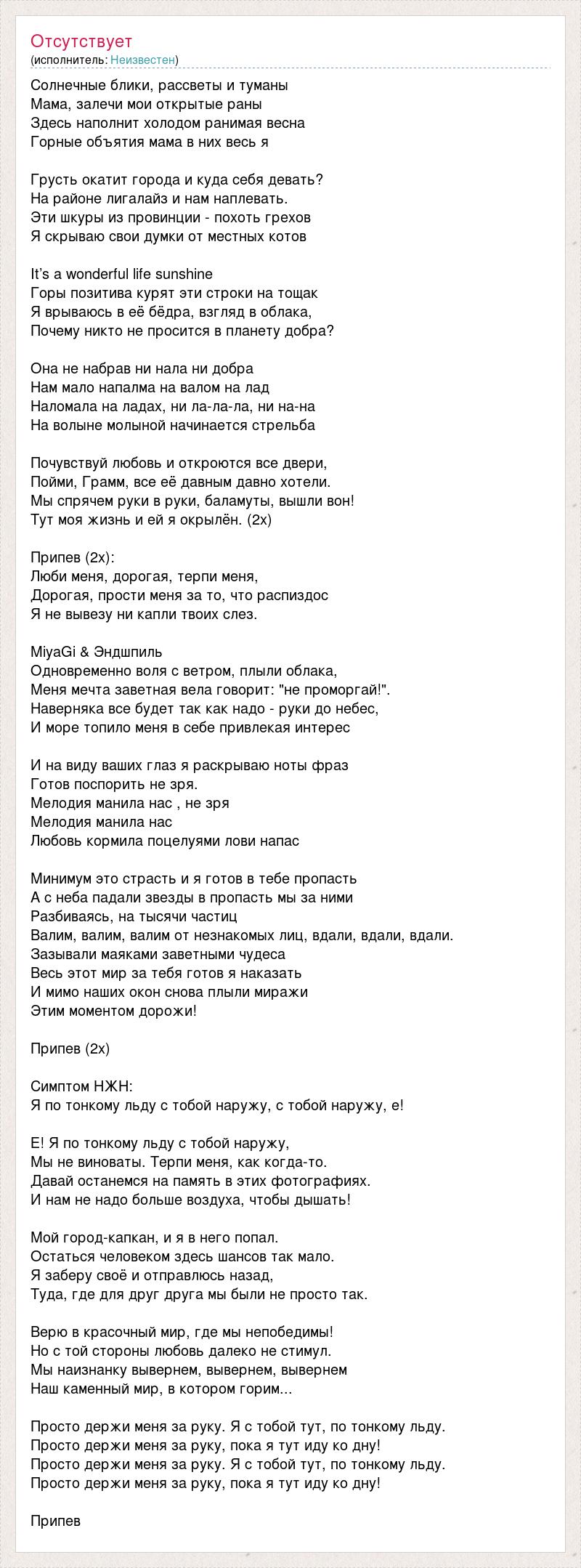 Солнечные блики, рассветы и туманы Мама, залечи мои открытые раны Здесь наполнит холодом ранимая весна Горные объятия мама в них весь я Грусть окатит города и куда себя девать? На районе лигалайз и нам наплевать. Эти шкуры из провинции - похоть грехов Я скрываю свои думки от местных котов It’s a wonderful life sunshine Горы позитива курят эти строки на тощак Я врываюсь в её бёдра, взгляд в облака, Почему никто не просится в планету добра? Она не набрав ни нала ни добра Нам мало напалма на валом на лад Наломала на ладах, ни ла-ла-ла, ни на-на На волыне молыной начинается стрельба Почувствуй любовь и откроются все двери, Пойми, Грамм, все её давным давно хотели. Мы спрячем руки в руки, баламуты, вышли вон! Тут моя жизнь и ей я окрылён. (2x) Припев (2x): Люби меня, дорогая, терпи меня, Дорогая, прости меня за то, что распиздос Я не вывезу ни капли твоих слез. MiyaGi & Эндшпиль Одновременно воля с ветром, плыли облака, Меня мечта заветная вела говорит: "не проморгай!". Наверняка все будет так как надо - руки до небес, И море топило меня в себе привлекая интерес И на виду ваших глаз я раскрываю ноты фраз Готов поспорить не зря. Мелодия манила нас , не зря Мелодия манила нас Любовь кормила поцелуями лови напас Минимум это страсть и я готов в тебе пропасть А с неба падали звезды в пропасть мы за ними Разбиваясь, на тысячи частиц Валим, валим, валим от незнакомых лиц, вдали, вдали, вдали. Зазывали маяками заветными чудеса Весь этот мир за тебя готов я наказать И мимо наших окон снова плыли миражи Этим моментом дорожи! Припев (2x) Симптом НЖН: Я по тонкому льду с тобой наружу, с тобой наружу, е! Е! Я по тонкому льду с тобой наружу, Мы не виноваты. Терпи меня, как когда-то. Давай останемся на память в этих фотографиях. И нам не надо больше воздуха, чтобы дышать! Мой город-капкан, и я в него попал. Остаться человеком здесь шансов так мало. Я заберу своё и отправлюсь назад, Туда, где для друг друга мы были не просто так. Верю в красочный мир, где мы непобедимы! Но с той стороны любовь далеко не стимул. Мы наизнанку вывернем, вывернем, вывернем Наш каменный мир, в котором горим... Просто держи меня за руку. Я с тобой тут, по тонкому льду. Просто держи меня за руку, пока я тут иду ко дну! Просто держи меня за руку. Я с тобой тут, по тонкому льду. Просто держи меня за руку, пока я тут иду ко дну! Припев