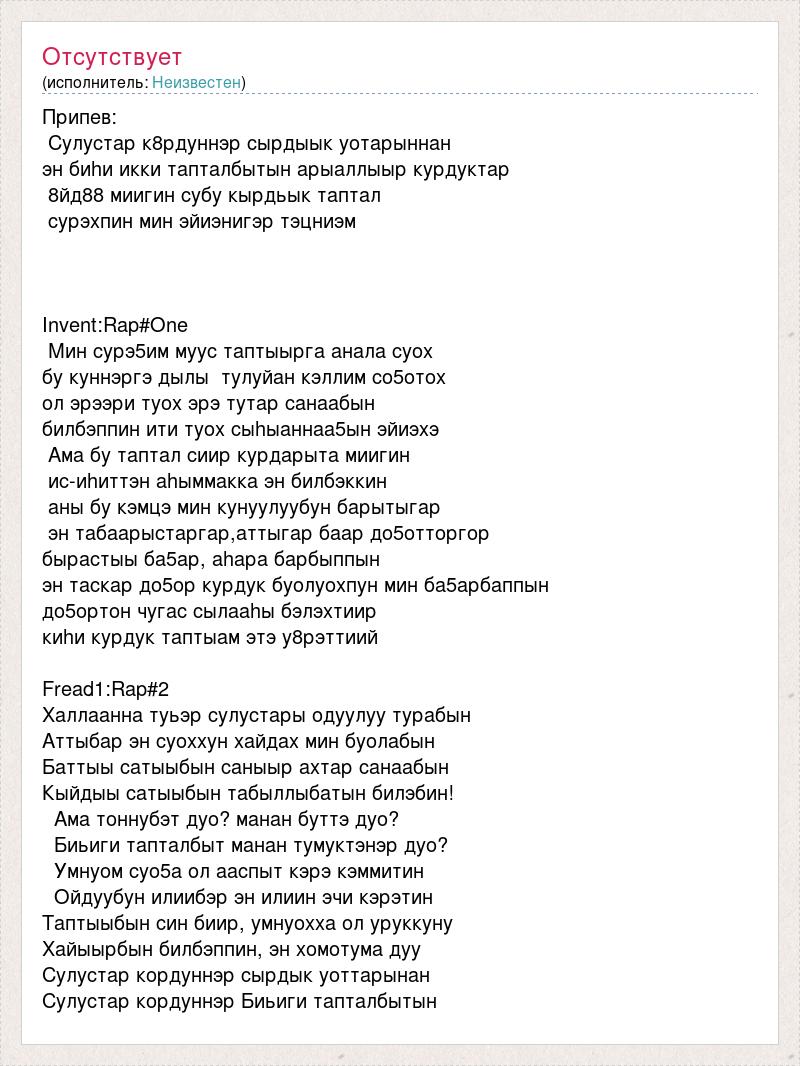 Припев: Сулустар к8рдуннэр сырдыык уотарыннан эн биhи икки тапталбытын арыаллыыр курдуктар 8йд88 миигин субу кырдьык таптал сурэхпин мин эйиэнигэр тэцниэм Invent:Rap#One Мин сурэ5им муус таптыырга анала суох бу куннэргэ дылы тулуйан кэллим со5отох ол эрээри туох эрэ тутар санаабын билбэппин ити туох сыhыаннаа5ын эйиэхэ Ама бу таптал сиир курдарыта миигин ис-иhиттэн аhыммакка эн билбэккин аны бу кэмцэ мин кунуулуубун барытыгар эн табаарыстаргар,аттыгар баар до5отторгор бырастыы ба5ар, аhара барбыппын эн таскар до5ор курдук буолуохпун мин ба5арбаппын до5ортон чугас сылааhы бэлэхтиир киhи курдук таптыам этэ у8рэттиий Fread1:Rap#2 Халлаанна туьэр сулустары одуулуу турабын Аттыбар эн суоххун хайдах мин буолабын Баттыы сатыыбын саныыр ахтар санаабын Кыйдыы сатыыбын табыллыбатын билэбин! Ама тоннубэт дуо? манан буттэ дуо? Биьиги тапталбыт манан тумуктэнэр дуо? Умнуом суо5а ол ааспыт кэрэ кэммитин Ойдуубун илиибэр эн илиин эчи кэрэтин Таптыыбын син биир, умнуохха ол уруккуну Хайыырбын билбэппин, эн хомотума дуу Сулустар кордуннэр сырдык уоттарынан Сулустар кордуннэр Биьиги тапталбытын
