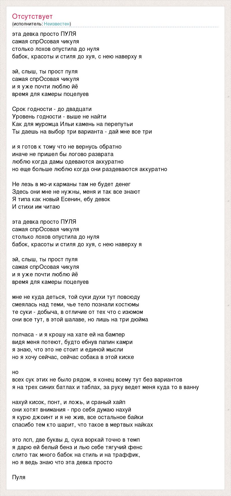 эта девка просто ПУЛЯ самая спрОсовая чикуля столько лохов опустила до нуля бабок, красоты и стиля до хуя, с нею наверху я эй, слыш, ты прост пуля самая спрОсовая чикуля и я уже почти люблю йё время для камеры поцелуев Срок годности - до двадцати Уровень годности - выше не найти Как для муромца Ильи камень на перепутьи Ты даешь на выбор три варианта - дай мне все три и я готов к тому что не вернусь обратно иначе не пришел бы логово разврата люблю когда дамы одеваются аккуратно но еще больше люблю когда они раздеваются аккуратно Не лезь в мо-и карманы там не будет денег Здесь они мне не нужны, меня и так все знают Я типа как новый Есенин, ебу девок И стихи им читаю эта девка просто ПУЛЯ самая спрОсовая чикуля столько лохов опустила до нуля бабок, красоты и стиля до хуя, с нею наверху я эй, слыш, ты прост пуля самая спрОсовая чикуля и я уже почти люблю йё время для камеры поцелуев мне не куда деться, той суки духи тут повсюду смеялась над теми, чье тело познали костюмы те суки - добыча, в отличие от тех что с изюмом они все тут, в этой шалаве, но лишь на три дюйма полчаса - и я крошу на хате ей на бампер видя меня потеют, будто ебнув папин камри я знаю, что это не стоит и единой мысли но я хочу сейчас, сейчас собака в этой киске но всех сук этих не было рядом, я конец всему тут без вариантов я на трех синих батлах и таблах, за руку ведет меня куда то в ванну нахуй кисок, понт, и ложь, и сраный хайп они хотят внимания - про себя думаю нахуй я курю джоинт и я не жив, все остальное байки спасибо тем кто шарит, что такое в мертвых найках это лсп, две буквы д, сука воркай точно в темп я дарю ей белый бенз и лью себе тягучий фенс слито так много бабок на стиль и на траффик, но я ведь знаю что эта девка просто Пуля