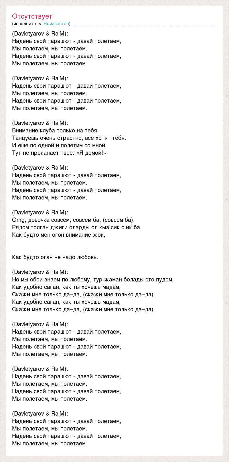 (Davletyarov & RaiM): Надень свой парашют - давай полетаем, Мы полетаем, мы полетаем. Надень свой парашют - давай полетаем, Мы полетаем, мы полетаем. (Davletyarov & RaiM): Надень свой парашют - давай полетаем, Мы полетаем, мы полетаем. Надень свой парашют - давай полетаем, Мы полетаем, мы полетаем. (Davletyarov & RaiM): Внимание клуба только на тебя. Танцуешь очень страстно, все хотят тебя. И еще по одной и полетим со мной. Тут не проканает твое: «Я домой!» (Davletyarov & RaiM): Надень свой парашют - давай полетаем, Мы полетаем, мы полетаем. Надень свой парашют - давай полетаем, Мы полетаем, мы полетаем. (Davletyarov & RaiM): Оmg, девочка совсем, совсем ба, (совсем ба). Рядом толган джиги оларды ол кыз сик с ик ба, Как будто мен огон внимание жок, Как будто оган не надо любовь. (Davletyarov & RaiM): Но мы обои знаем по любому, тур жаман болады сто пудом, Как удобно саган, как ты хочешь мадам, Скажи мне только да–да, (скажи мне только да–да). Как удобно саган, как ты хочешь мадам, Скажи мне только да–да, (скажи мне только да–да). (Davletyarov & RaiM): Надень свой парашют - давай полетаем, Мы полетаем, мы полетаем. Надень свой парашют - давай полетаем, Мы полетаем, мы полетаем. (Davletyarov & RaiM): Надень свой парашют - давай полетаем, Мы полетаем, мы полетаем. Надень свой парашют - давай полетаем, Мы полетаем, мы полетаем. (Davletyarov & RaiM): Надень свой парашют - давай полетаем, Мы полетаем, мы полетаем. Надень свой парашют - давай полетаем, Мы полетаем, мы полетаем.
