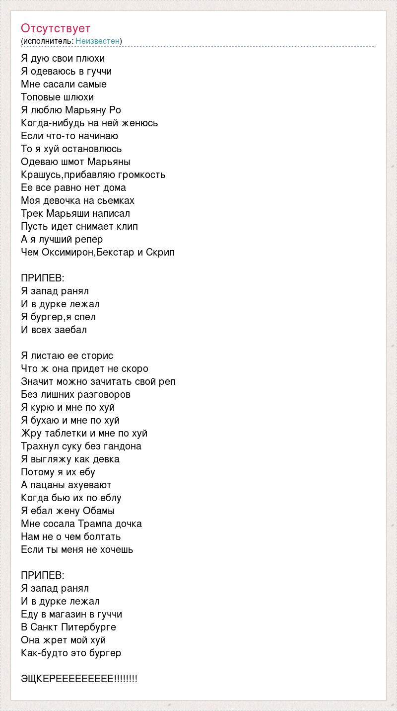 Я дую свои плюхи Я одеваюсь в гуччи Мне сасали самые Топовые шлюхи Я люблю Марьяну Ро Когда-нибудь на ней женюсь Если что-то начинаю То я хуй остановлюсь Одеваю шмот Марьяны Крашусь,прибавляю громкость Ее все равно нет дома Моя девочка на сьемках Трек Марьяши написал Пусть идет снимает клип А я лучший репер Чем Оксимирон,Бекстар и Скрип ПРИПЕВ: Я запад ранял И в дурке лежал Я бургер,я спел И всех заебал Я листаю ее сторис Что ж она придет не скоро Значит можно зачитать свой реп Без лишних разговоров Я курю и мне по хуй Я бухаю и мне по хуй Жру таблетки и мне по хуй Трахнул суку без гандона Я выгляжу как девка Потому я их ебу А пацаны ахуевают Когда бью их по еблу Я ебал жену Обамы Мне сосала Трампа дочка Нам не о чем болтать Если ты меня не хочешь ПРИПЕВ: Я запад ранял И в дурке лежал Еду в магазин в гуччи В Санкт Питербурге Она жрет мой хуй Как-будто это бургер ЭЩКЕРЕЕЕЕЕЕЕЕЕ!!!!!!!!