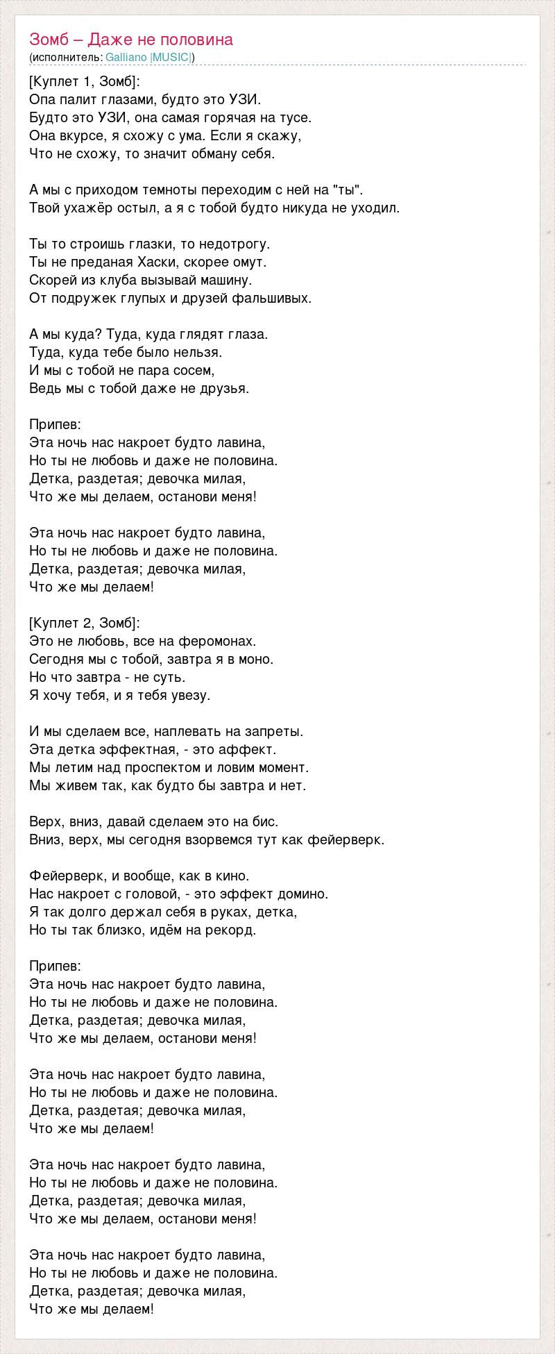 [Куплет 1, Зомб]: Опа палит глазами, будто это УЗИ. Будто это УЗИ, она самая горячая на тусе. Она вкурсе, я схожу с ума. Если я скажу, Что не схожу, то значит обману себя. А мы с приходом темноты переходим с ней на "ты". Твой ухажёр остыл, а я с тобой будто никуда не уходил. Ты то строишь глазки, то недотрогу. Ты не преданая Хаски, скорее омут. Скорей из клуба вызывай машину. От подружек глупых и друзей фальшивых. А мы куда? Туда, куда глядят глаза. Туда, куда тебе было нельзя. И мы с тобой не пара сосем, Ведь мы с тобой даже не друзья. Припев: Эта ночь нас накроет будто лавина, Но ты не любовь и даже не половина. Детка, раздетая; девочка милая, Что же мы делаем, останови меня! Эта ночь нас накроет будто лавина, Но ты не любовь и даже не половина. Детка, раздетая; девочка милая, Что же мы делаем! [Куплет 2, Зомб]: Это не любовь, все на феромонах. Сегодня мы с тобой, завтра я в моно. Но что завтра - не суть. Я хочу тебя, и я тебя увезу. И мы сделаем все, наплевать на запреты. Эта детка эффектная, - это аффект. Мы летим над проспектом и ловим момент. Мы живем так, как будто бы завтра и нет. Верх, вниз, давай сделаем это на бис. Вниз, верх, мы сегодня взорвемся тут как фейерверк. Фейерверк, и вообще, как в кино. Нас накроет с головой, - это эффект домино. Я так долго держал себя в руках, детка, Но ты так близко, идём на рекорд. Припев: Эта ночь нас накроет будто лавина, Но ты не любовь и даже не половина. Детка, раздетая; девочка милая, Что же мы делаем, останови меня! Эта ночь нас накроет будто лавина, Но ты не любовь и даже не половина. Детка, раздетая; девочка милая, Что же мы делаем! Эта ночь нас накроет будто лавина, Но ты не любовь и даже не половина. Детка, раздетая; девочка милая, Что же мы делаем, останови меня! Эта ночь нас накроет будто лавина, Но ты не любовь и даже не половина. Детка, раздетая; девочка милая, Что же мы делаем!
