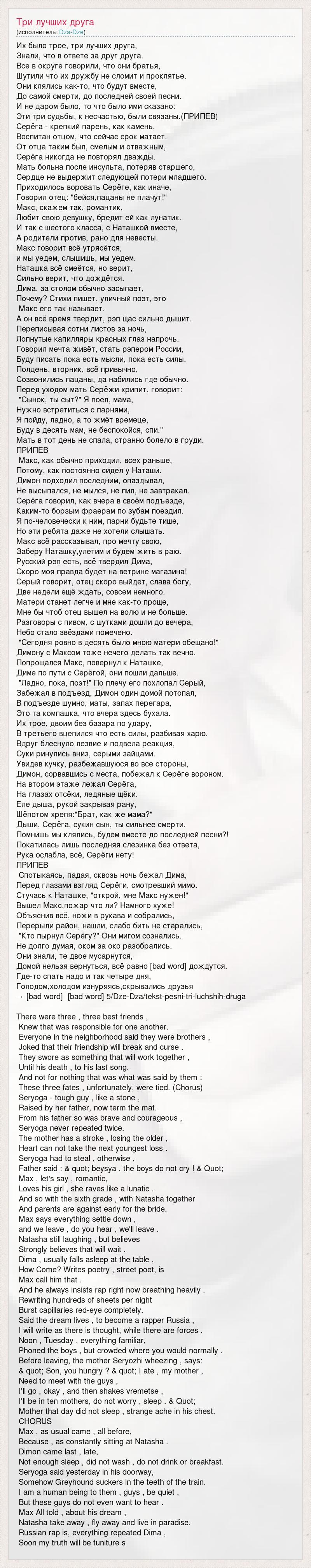 Их было трое, три лучших друга, Знали, что в ответе за друг друга. Все в округе говорили, что они братья, Шутили что их дружбу не сломит и проклятье. Они клялись как-то, что будут вместе, До самой смерти, до последней своей песни. И не даром было, то что было ими сказано: Эти три судьбы, к несчастью, были связаны.(ПРИПЕВ) Серёга - крепкий парень, как камень, Воспитан отцом, что сейчас срок матает. От отца таким был, смелым и отважным, Серёга никогда не повторял дважды. Мать больна после инсульта, потеряв старшего, Сердце не выдержит следующей потери младшего. Приходилось воровать Серёге, как иначе, Говорил отец: "бейся,пацаны не плачут!" Макс, скажем так, романтик, Любит свою девушку, бредит ей как лунатик. И так с шестого класса, с Наташкой вместе, А родители против, рано для невесты. Макс говорит всё утрясётся, и мы уедем, слышишь, мы уедем. Наташка всё смеётся, но верит, Сильно верит, что дождётся. Дима, за столом обычно засыпает, Почему? Стихи пишет, уличный поэт, это Макс его так называет. А он всё время твердит, рэп щас сильно дышит. Переписывая сотни листов за ночь, Лопнутые капилляры красных глаз напрочь. Говорил мечта живёт, стать рэпером России, Буду писать пока есть мысли, пока есть силы. Полдень, вторник, всё привычно, Созвонились пацаны, да набились где обычно. Перед уходом мать Серёжи хрипит, говорит: "Сынок, ты сыт?" Я поел, мама, Нужно встретиться с парнями, Я пойду, ладно, а то жмёт времеце, Буду в десять мам, не беспокойся, спи." Мать в тот день не спала, странно болело в груди. ПРИПЕВ Макс, как обычно приходил, всех раньше, Потому, как постоянно сидел у Наташи. Димон подходил последним, опаздывал, Не высыпался, не мылся, не пил, не завтракал. Серёга говорил, как вчера в своём подъезде, Каким-то борзым фраерам по зубам поездил. Я по-человечески к ним, парни будьте тише, Но эти ребята даже не хотели слышать. Макс всё рассказывал, про мечту свою, Заберу Наташку,улетим и будем жить в раю. Русский рэп есть, всё твердил Дима, Скоро моя правда будет на ветрине магазина! Серый говорит, отец скоро выйдет, слава богу, Две недели ещё ждать, совсем немного. Матери станет легче и мне как-то проще, Мне бы чтоб отец вышел на волю и не больше. Разговоры с пивом, с шутками дошли до вечера, Небо стало звёздами помечено. "Сегодня ровно в десять было мною матери обещано!" Димону с Максом тоже нечего делать так вечно. Попрощался Макс, повернул к Наташке, Диме по пути с Серёгой, они пошли дальше. "Ладно, пока, поэт!" По плечу его похлопал Серый, Забежал в подъезд, Димон один домой потопал, В подъезде шумно, маты, запах перегара, Это та компашка, что вчера здесь бухала. Их трое, двоим без базара по удару, В третьего вцепился что есть силы, разбивая харю. Вдруг блеснуло лезвие и подвела реакция, Суки ринулись вниз, серыми зайцами. Увидев кучку, разбежавшуюся во все стороны, Димон, сорвавшись с места, побежал к Серёге вороном. На втором этаже лежал Серёга, На глазах отсёки, ледяные щёки. Еле дыша, рукой закрывая рану, Шёпотом хрепя:"Брат, как же мама?" Дыши, Серёга, сукин сын, ты сильнее смерти. Помнишь мы клялись, будем вместе до последней песни?! Покатилась лишь последняя слезинка без ответа, Рука ослабла, всё, Серёги нету! ПРИПЕВ Спотыкаясь, падая, сквозь ночь бежал Дима, Перед глазами взгляд Серёги, смотревший мимо. Стучась к Наташке, "открой, мне Макс нужен!" Вышел Макс,пожар что ли? Намного хуже! Объясн