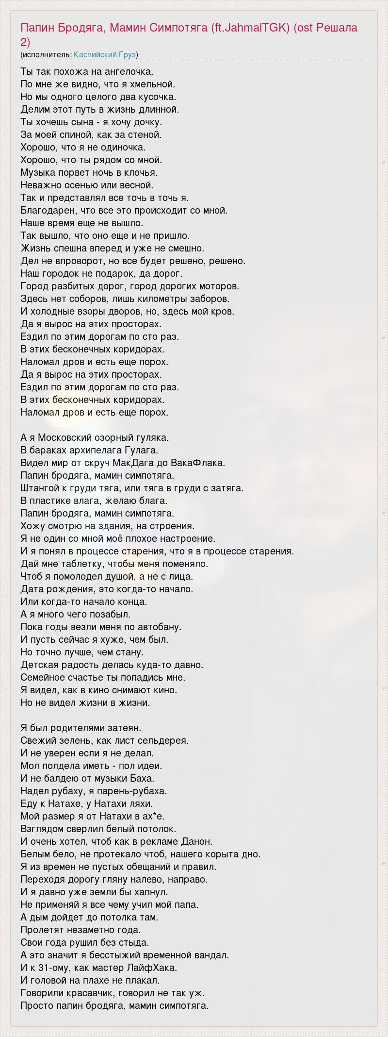 Ты так похожа на ангелочка. По мне же видно, что я хмельной. Но мы одного целого два кусочка. Делим этот путь в жизнь длинной. Ты хочешь сына - я хочу дочку. За моей спиной, как за стеной. Хорошо, что я не одиночка. Хорошо, что ты рядом со мной. Музыка порвет ночь в клочья. Неважно осенью или весной. Так и представлял все точь в точь я. Благодарен, что все это происходит со мной. Наше время еще не вышло. Так вышло, что оно еще и не пришло. Жизнь спешна вперед и уже не смешно. Дел не впроворот, но все будет решено, решено. Наш городок не подарок, да дорог. Город разбитых дорог, город дорогих моторов. Здесь нет соборов, лишь километры заборов. И холодные взоры дворов, но, здесь мой кров. Да я вырос на этих просторах. Ездил по этим дорогам по сто раз. В этих бесконечных коридорах. Наломал дров и есть еще порох. Да я вырос на этих просторах. Ездил по этим дорогам по сто раз. В этих бесконечных коридорах. Наломал дров и есть еще порох. А я Московский озорный гуляка. В бараках архипелага Гулага. Видел мир от скруч МакДага до ВакаФлака. Папин бродяга, мамин симпотяга. Штангой к груди тяга, или тяга в груди с затяга. В пластике влага, желаю блага. Папин бродяга, мамин симпотяга. Хожу смотрю на здания, на строения. Я не один со мной моё плохое настроение. И я понял в процессе старения, что я в процессе старения. Дай мне таблетку, чтобы меня поменяло. Чтоб я помолодел душой, а не с лица. Дата рождения, это когда-то начало. Или когда-то начало конца. А я много чего позабыл. Пока годы везли меня по автобану. И пусть сейчас я хуже, чем был. Но точно лучше, чем стану. Детская радость делась куда-то давно. Семейное счастье ты попадись мне. Я видел, как в кино снимают кино. Но не видел жизни в жизни. Я был родителями затеян. Свежий зелень, как лист сельдерея. И не уверен если я не делал. Мол полдела иметь - пол идеи. И не балдею от музыки Баха. Надел рубаху, я парень-рубаха. Еду к Натахе, у Натахи ляхи. Мой размер я от Натахи в ах*е. Взглядом сверлил белый потолок. И очень хотел, чтоб как в рекламе Данон. Белым бело, не протекало чтоб, нашего корыта дно. Я из времен не пустых обещаний и правил. Переходя дорогу гляну налево, направо. И я давно уже земли бы хапнул. Не применяй я все чему учил мой папа. А дым дойдет до потолка там. Пролетят незаметно года. Свои года рушил без стыда. А это значит я бесстыжий временной вандал. И к 31-ому, как мастер ЛайфХака. И головой на плахе не плакал. Говорили красавчик, говорил не так уж. Просто папин бродяга, мамин симпотяга.