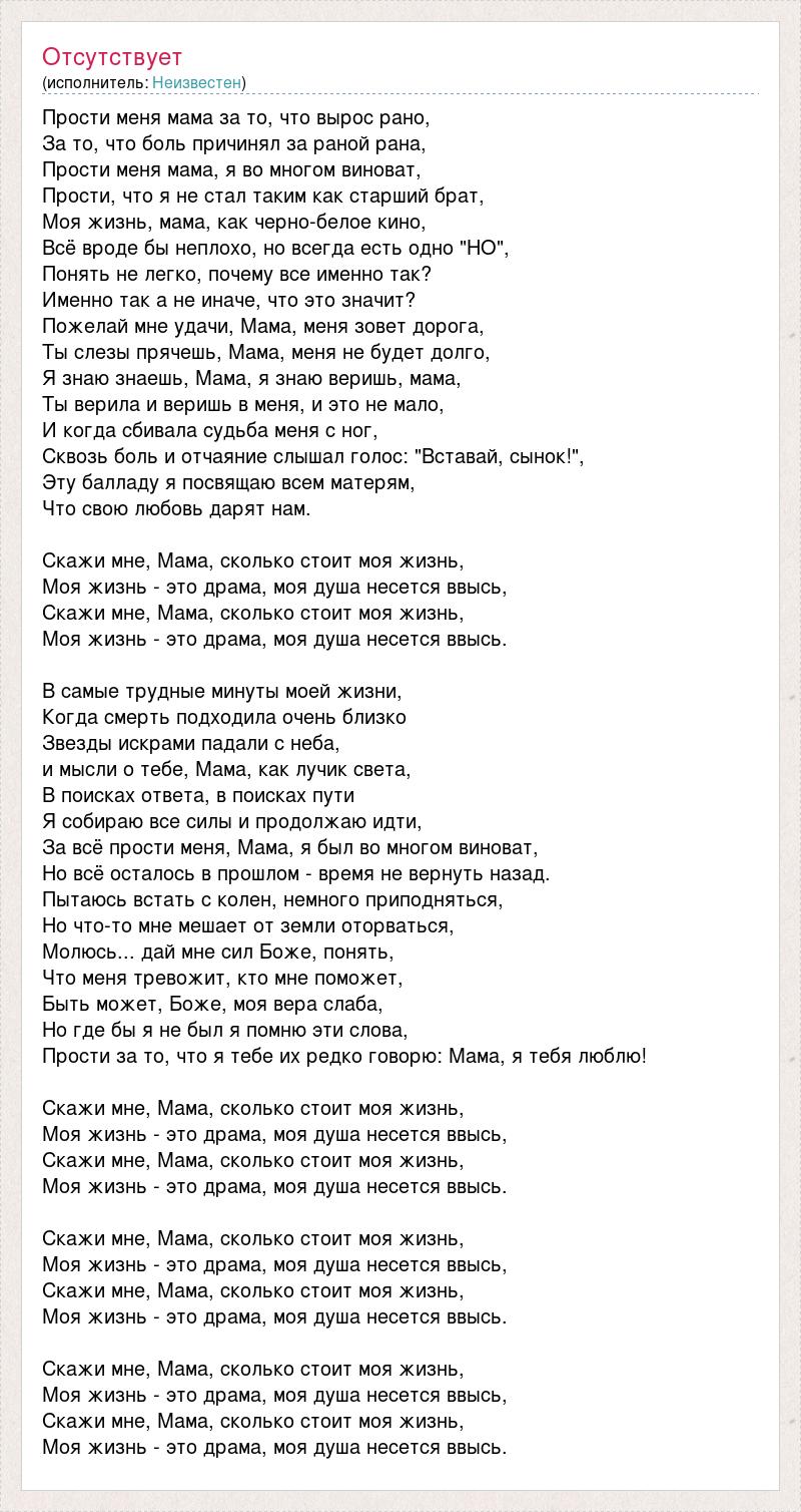 Прости меня мама за то, что вырос рано, За то, что боль причинял за раной рана, Прости меня мама, я во многом виноват, Прости, что я не стал таким как старший брат, Моя жизнь, мама, как черно-белое кино, Всё вроде бы неплохо, но всегда есть одно "НО", Понять не легко, почему все именно так? Именно так а не иначе, что это значит? Пожелай мне удачи, Мама, меня зовет дорога, Ты слезы прячешь, Мама, меня не будет долго, Я знаю знаешь, Мама, я знаю веришь, мама, Ты верила и веришь в меня, и это не мало, И когда сбивала судьба меня с ног, Сквозь боль и отчаяние слышал голос: "Вставай, сынок!", Эту балладу я посвящаю всем матерям, Что свою любовь дарят нам. Скажи мне, Мама, сколько стоит моя жизнь, Моя жизнь - это драма, моя душа несется ввысь, Скажи мне, Мама, сколько стоит моя жизнь, Моя жизнь - это драма, моя душа несется ввысь. В самые трудные минуты моей жизни, Когда смерть подходила очень близко Звезды искрами падали с неба, и мысли о тебе, Мама, как лучик света, В поисках ответа, в поисках пути Я собираю все силы и продолжаю идти, За всё прости меня, Мама, я был во многом виноват, Но всё осталось в прошлом - время не вернуть назад. Пытаюсь встать с колен, немного приподняться, Но что-то мне мешает от земли оторваться, Молюсь... дай мне сил Боже, понять, Что меня тревожит, кто мне поможет, Быть может, Боже, моя вера слаба, Но где бы я не был я помню эти слова, Прости за то, что я тебе их редко говорю: Мама, я тебя люблю! Скажи мне, Мама, сколько стоит моя жизнь, Моя жизнь - это драма, моя душа несется ввысь, Скажи мне, Мама, сколько стоит моя жизнь, Моя жизнь - это драма, моя душа несется ввысь. Скажи мне, Мама, сколько стоит моя жизнь, Моя жизнь - это драма, моя душа несется ввысь, Скажи мне, Мама, сколько стоит моя жизнь, Моя жизнь - это драма, моя душа несется ввысь. Скажи мне, Мама, сколько стоит моя жизнь, Моя жизнь - это драма, моя душа несется ввысь, Скажи мне, Мама, сколько стоит моя жизнь, Моя жизнь - это драма, моя душа несется ввысь.