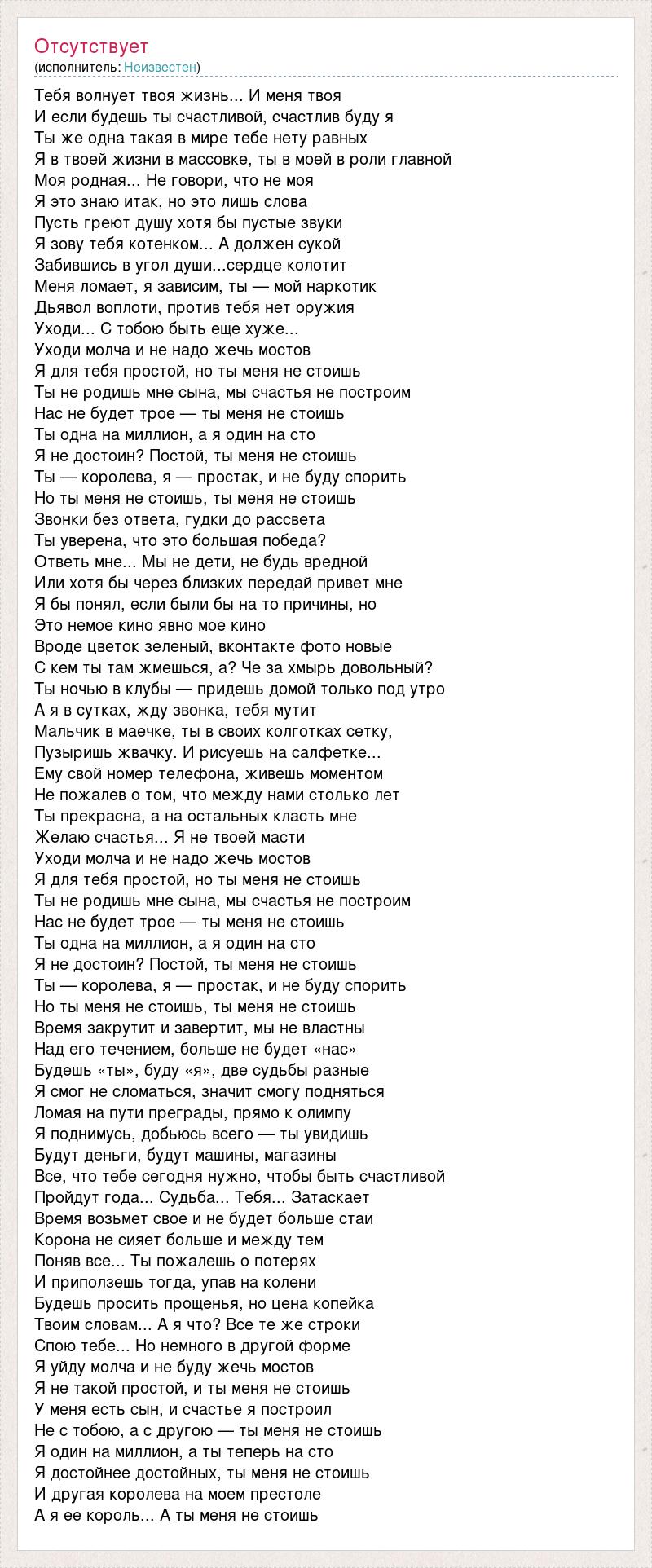 Тебя волнует твоя жизнь... И меня твоя И если будешь ты счастливой, счастлив буду я Ты же одна такая в мире тебе нету равных Я в твоей жизни в массовке, ты в моей в роли главной Моя родная... Не говори, что не моя Я это знаю итак, но это лишь слова Пусть греют душу хотя бы пустые звуки Я зову тебя котенком... А должен сукой Забившись в угол души...сердце колотит Меня ломает, я зависим, ты — мой наркотик Дьявол воплоти, против тебя нет оружия Уходи... С тобою быть еще хуже... Уходи молча и не надо жечь мостов Я для тебя простой, но ты меня не стоишь Ты не родишь мне сына, мы счастья не построим Нас не будет трое — ты меня не стоишь Ты одна на миллион, а я один на сто Я не достоин? Постой, ты меня не стоишь Ты — королева, я — простак, и не буду спорить Но ты меня не стоишь, ты меня не стоишь Звонки без ответа, гудки до рассвета Ты уверена, что это большая победа? Ответь мне... Мы не дети, не будь вредной Или хотя бы через близких передай привет мне Я бы понял, если были бы на то причины, но Это немое кино явно мое кино Вроде цветок зеленый, вконтакте фото новые С кем ты там жмешься, а? Че за хмырь довольный? Ты ночью в клубы — придешь домой только под утро А я в сутках, жду звонка, тебя мутит Мальчик в маечке, ты в своих колготках сетку, Пузыришь жвачку. И рисуешь на салфетке... Ему свой номер телефона, живешь моментом Не пожалев о том, что между нами столько лет Ты прекрасна, а на остальных класть мне Желаю счастья... Я не твоей масти Уходи молча и не надо жечь мостов Я для тебя простой, но ты меня не стоишь Ты не родишь мне сына, мы счастья не построим Нас не будет трое — ты меня не стоишь Ты одна на миллион, а я один на сто Я не достоин? Постой, ты меня не стоишь Ты — королева, я — простак, и не буду спорить Но ты меня не стоишь, ты меня не стоишь Время закрутит и завертит, мы не властны Над его течением, больше не будет «нас» Будешь «ты», буду «я», две судьбы разные Я смог не сломаться, значит смогу подняться Ломая на пути преграды, прямо к олимпу Я поднимусь, добьюсь всего — ты увидишь Будут деньги, будут машины, магазины Все, что тебе сегодня нужно, чтобы быть счастливой Пройдут года... Судьба... Тебя... Затаскает Время возьмет свое и не будет больше стаи Корона не сияет больше и между тем Поняв все... Ты пожалешь о потерях И приползешь тогда, упав на колени Будешь просить прощенья, но цена копейка Твоим словам... А я что? Все те же строки Спою тебе... Но немного в другой форме Я уйду молча и не буду жечь мостов Я не такой простой, и ты меня не стоишь У меня есть сын, и счастье я построил Не с тобою, а с другою — ты меня не стоишь Я один на миллион, а ты теперь на сто Я достойнее достойных, ты меня не стоишь И другая королева на моем престоле А я ее король... А ты меня не стоишь