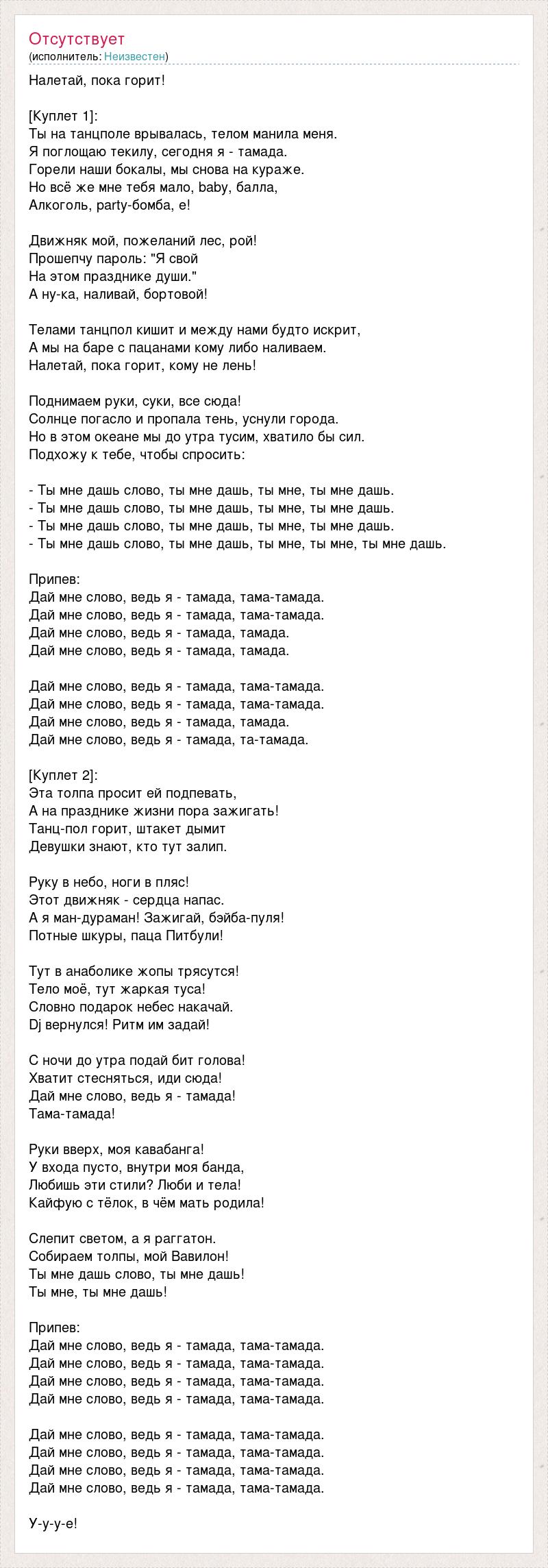 Налетай, пока горит! [Куплет 1]: Ты на танцполе врывалась, телом манила меня. Я поглощаю текилу, сегодня я - тамада. Горели наши бокалы, мы снова на кураже. Но всё же мне тебя мало, baby, балла, Алкоголь, party-бомба, е! Движняк мой, пожеланий лес, рой! Прошепчу пароль: "Я свой На этом празднике души." А ну-ка, наливай, бортовой! Телами танцпол кишит и между нами будто искрит, А мы на баре с пацанами кому либо наливаем. Налетай, пока горит, кому не лень! Поднимаем руки, суки, все сюда! Солнце погасло и пропала тень, уснули города. Но в этом океане мы до утра тусим, хватило бы сил. Подхожу к тебе, чтобы спросить: - Ты мне дашь слово, ты мне дашь, ты мне, ты мне дашь. - Ты мне дашь слово, ты мне дашь, ты мне, ты мне дашь. - Ты мне дашь слово, ты мне дашь, ты мне, ты мне дашь. - Ты мне дашь слово, ты мне дашь, ты мне, ты мне, ты мне дашь. Припев: Дай мне слово, ведь я - тамада, тама-тамада. Дай мне слово, ведь я - тамада, тама-тамада. Дай мне слово, ведь я - тамада, тамада. Дай мне слово, ведь я - тамада, тамада. Дай мне слово, ведь я - тамада, тама-тамада. Дай мне слово, ведь я - тамада, тама-тамада. Дай мне слово, ведь я - тамада, тамада. Дай мне слово, ведь я - тамада, та-тамада. [Куплет 2]: Эта толпа просит ей подпевать, А на празднике жизни пора зажигать! Танц-пол горит, штакет дымит Девушки знают, кто тут залип. Руку в небо, ноги в пляс! Этот движняк - сердца напас. А я ман-дураман! Зажигай, бэйба-пуля! Потные шкуры, паца Питбули! Тут в анаболике жопы трясутся! Тело моё, тут жаркая туса! Словно подарок небес накачай. Dj вернулся! Ритм им задай! С ночи до утра подай бит голова! Хватит стесняться, иди сюда! Дай мне слово, ведь я - тамада! Тама-тамада! Руки вверх, моя кавабанга! У входа пусто, внутри моя банда, Любишь эти стили? Люби и тела! Кайфую с тёлок, в чём мать родила! Слепит светом, а я раггатон. Собираем толпы, мой Вавилон! Ты мне дашь слово, ты мне дашь! Ты мне, ты мне дашь! Припев: Дай мне слово, ведь я - тамада, тама-тамада. Дай мне слово, ведь я - тамада, тама-тамада. Дай мне слово, ведь я - тамада, тама-тамада. Дай мне слово, ведь я - тамада, тама-тамада. Дай мне слово, ведь я - тамада, тама-тамада. Дай мне слово, ведь я - тамада, тама-тамада. Дай мне слово, ведь я - тамада, тама-тамада. Дай мне слово, ведь я - тамада, тама-тамада. У-у-у-е!