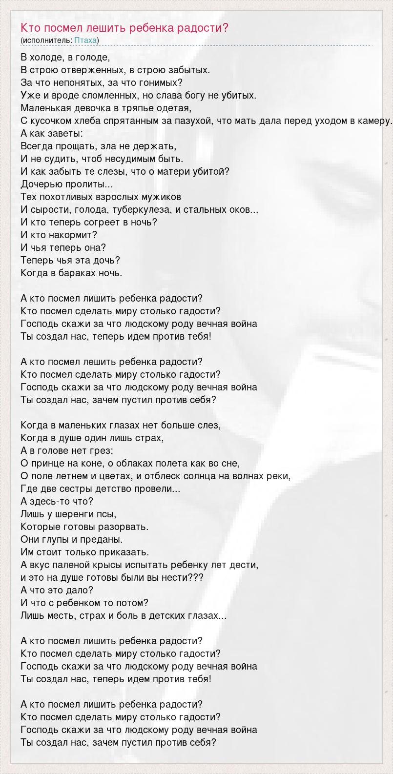 В холоде, в голоде, В строю отверженных, в строю забытых. За что непонятых, за что гонимых? Уже и вроде сломленных, но слава богу не убитых. Маленькая девочка в тряпье одетая, С кусочком хлеба спрятанным за пазухой, что мать дала перед уходом в камеру. А как заветы: Всегда прощать, зла не держать, И не судить, чтоб несудимым быть. И как забыть те слезы, что о матери убитой? Дочерью пролиты... Тех похотливых взрослых мужиков И сырости, голода, туберкулеза, и стальных оков... И кто теперь согреет в ночь? И кто накормит? И чья теперь она? Теперь чья эта дочь? Когда в бараках ночь. А кто посмел лишить ребенка радости? Кто посмел сделать миру столько гадости? Господь скажи за что людскому роду вечная война Ты создал нас, теперь идем против тебя! А кто посмел лешить ребенка радости? Кто посмел сделать миру столько гадости? Господь скажи за что людскому роду вечная война Ты создал нас, зачем пустил против себя? Когда в маленьких глазах нет больше слез, Когда в душе один лишь страх, А в голове нет грез: О принце на коне, о облаках полета как во сне, О поле летнем и цветах, и отблеск солнца на волнах реки, Где две сестры детство провели... А здесь-то что? Лишь у шеренги псы, Которые готовы разорвать. Они глупы и преданы. Им стоит только приказать. А вкус паленой крысы испытать ребенку лет дести, и это на душе готовы были вы нести??? А что это дало? И что с ребенком то потом? Лишь месть, страх и боль в детских глазах... А кто посмел лишить ребенка радости? Кто посмел сделать миру столько гадости? Господь скажи за что людскому роду вечная война Ты создал нас, теперь идем против тебя! А кто посмел лишить ребенка радости? Кто посмел сделать миру столько гадости? Господь скажи за что людскому роду вечная война Ты создал нас, зачем пустил против себя?