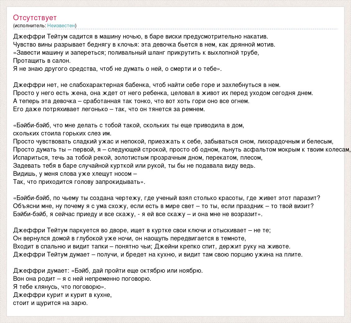 Джеффри Тейтум садится в машину ночью, в баре виски предусмотрительно накатив. Чувство вины разрывает беднягу в клочья: эта девочка бьется в нем, как дрянной мотив. «Завести машину и запереться; поливальный шланг прикрутить к выхлопной трубе, Протащить в салон. Я не знаю другого средства, чтоб не думать о ней, о смерти и о тебе». Джеффри нет, не слабохарактерная бабенка, чтоб найти себе горе и захлебнуться в нем. Просто у него есть жена, она ждет от него ребенка, целовал в живот их перед уходом сегодня днем. А теперь эта девочка – сработанная так тонко, что вот хоть гори оно все огнем. Его даже потряхивает легонько – так, что он тянется за ремнем. «Бэйби-бэйб, что мне делать с тобой такой, скольких ты еще приводила в дом, скольких стоила горьких слез им. Просто чувствовать сладкий ужас и непокой, приезжать к себе, забываться сном, лихорадочным и белесым, Просто думать ты – первой, я – следующей строкой, просто об одном, льнуть асфальтом мокрым к твоим колесам, Испариться, течь за тобой рекой, золотистым прозрачным дном, перекатом, плесом, Задевать тебя в баре случайной курткой или рукой, ты бы не подавала виду ведь. Видишь, у меня слова уже хлещут носом – Так, что приходится голову запрокидывать». «Бэйби-бэйб, по чьему ты создана чертежу, где ученый взял столько красоты, где живет этот паразит? Объясни мне, ну почему я с ума схожу, если есть в мире свет – то ты, если праздник – то твой визит? Бэйби-бэйб, я сейчас приеду и все скажу, - я ей все скажу – и она мне не возразит». Джеффри Тейтум паркуется во дворе, ищет в куртке свои ключи и отыскивает – не те; Он вернулся домой в глубокой уже ночи, он наощупь передвигается в темноте, Входит в спальню и видит тапки – понятно чьи; Джейни крепко спит, держит руку на животе. Джеффри Тейтум думает – получи, и бредет на кухню, и видит там свою порцию ужина на плите. Джеффри думает: «Бэйб, дай пройти еще октябрю или ноябрю. Вон она родит – я с ней непременно поговорю. Я тебе клянусь, что поговорю». Джеффри курит и курит в кухне, стоит и щурится на зарю.