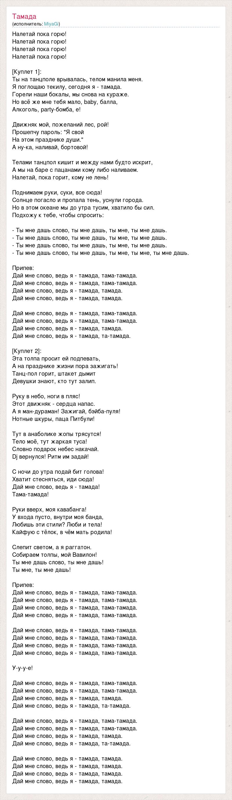 Налетай пока горю! Налетай пока горю! Налетай пока горю! Налетай пока горю! [Куплет 1]: Ты на танцполе врывалась, телом манила меня. Я поглощаю текилу, сегодня я - тамада. Горели наши бокалы, мы снова на кураже. Но всё же мне тебя мало, baby, балла, Алкоголь, party-бомба, е! Движняк мой, пожеланий лес, рой! Прошепчу пароль: "Я свой На этом празднике души." А ну-ка, наливай, бортовой! Телами танцпол кишит и между нами будто искрит, А мы на баре с пацанами кому либо наливаем. Налетай, пока горит, кому не лень! Поднимаем руки, суки, все сюда! Солнце погасло и пропала тень, уснули города. Но в этом океане мы до утра тусим, хватило бы сил. Подхожу к тебе, чтобы спросить: - Ты мне дашь слово, ты мне дашь, ты мне, ты мне дашь. - Ты мне дашь слово, ты мне дашь, ты мне, ты мне дашь. - Ты мне дашь слово, ты мне дашь, ты мне, ты мне дашь. - Ты мне дашь слово, ты мне дашь, ты мне, ты мне, ты мне дашь. Припев: Дай мне слово, ведь я - тамада, тама-тамада. Дай мне слово, ведь я - тамада, тама-тамада. Дай мне слово, ведь я - тамада, тамада. Дай мне слово, ведь я - тамада, тамада. Дай мне слово, ведь я - тамада, тама-тамада. Дай мне слово, ведь я - тамада, тама-тамада. Дай мне слово, ведь я - тамада, тамада. Дай мне слово, ведь я - тамада, та-тамада. [Куплет 2]: Эта толпа просит ей подпевать, А на празднике жизни пора зажигать! Танц-пол горит, штакет дымит Девушки знают, кто тут залип. Руку в небо, ноги в пляс! Этот движняк - сердца напас. А я ман-дураман! Зажигай, бэйба-пуля! Нотные шкуры, паца Питбули! Тут в анаболике жопы трясутся! Тело моё, тут жаркая туса! Словно подарок небес накачай. Dj вернулся! Ритм им задай! С ночи до утра подай бит голова! Хватит стесняться, иди сюда! Дай мне слово, ведь я - тамада! Тама-тамада! Руки вверх, моя кавабанга! У входа пусто, внутри моя банда, Любишь эти стили? Люби и тела! Кайфую с тёлок, в чём мать родила! Слепит светом, а я раггатон. Собираем толпы, мой Вавилон! Ты мне дашь слово, ты мне дашь! Ты мне, ты мне дашь! Припев: Дай мне слово, ведь я - тамада, тама-тамада. Дай мне слово, ведь я - тамада, тама-тамада. Дай мне слово, ведь я - тамада, тама-тамада. Дай мне слово, ведь я - тамада, тама-тамада. Дай мне слово, ведь я - тамада, тама-тамада. Дай мне слово, ведь я - тамада, тама-тамада. Дай мне слово, ведь я - тамада, тама-тамада. Дай мне слово, ведь я - тамада, тама-тамада. У-у-у-е! Дай мне слово, ведь я - тамада, тама-тамада. Дай мне слово, ведь я - тамада, тама-тамада. Дай мне слово, ведь я - тамада, тамада. Дай мне слово, ведь я - тамада, та-тамада. Дай мне слово, ведь я - тамада, тама-тамада. Дай мне слово, ведь я - тамада, тама-тамада. Дай мне слово, ведь я - тамада, тамада. Дай мне слово, ведь я - тамада, та-тамада. Дай мне слово, ведь я - тамада, тамада. Дай мне слово, ведь я - тамада, тамада. Дай мне слово, ведь я - тамада, тамада. Дай мне слово, ведь я - тамада, тамада.
