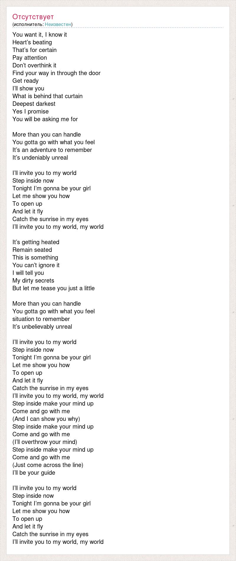 You want it, I know it Heart’s beating That’s for certain Pay attention Don’t overthink it Find your way in through the door Get ready I’ll show you What is behind that curtain Deepest darkest Yes I promise You will be asking me for More than you can handle You gotta go with what you feel It’s an adventure to remember It’s undeniably unreal I’ll invite you to my world Step inside now Tonight I’m gonna be your girl Let me show you how To open up And let it fly Catch the sunrise in my eyes I’ll invite you to my world, my world It’s getting heated Remain seated This is something You can’t ignore it I will tell you My dirty secrets But let me tease you just a little More than you can handle You gotta go with what you feel situation to remember It’s unbelievably unreal I’ll invite you to my world Step inside now Tonight I’m gonna be your girl Let me show you how To open up And let it fly Catch the sunrise in my eyes I’ll invite you to my world, my world Step inside make your mind up Come and go with me (And I can show you why) Step inside make your mind up Come and go with me (I’ll overthrow your mind) Step inside make your mind up Come and go with me (Just come across the line) I’ll be your guide I’ll invite you to my world Step inside now Tonight I’m gonna be your girl Let me show you how To open up And let it fly Catch the sunrise in my eyes I’ll invite you to my world, my world