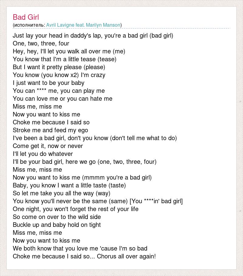 Just lay your head in daddy's lap, you're a bad girl (bad girl) One, two, three, four Hey, hey, I'll let you walk all over me (me) You know that I'm a little tease (tease) But I want it pretty please (please) You know (you know x2) I'm crazy I just want to be your baby You can **** me, you can play me You can love me or you can hate me Miss me, miss me Now you want to kiss me Choke me because I said so Stroke me and feed my ego I've been a bad girl, don't you know (don't tell me what to do) Come get it, now or never I'll let you do whatever I'll be your bad girl, here we go (one, two, three, four) Miss me, miss me Now you want to kiss me (mmmm you're a bad girl) Baby, you know I want a little taste (taste) So let me take you all the way (way) You know you'll never be the same (same) [You ****in' bad girl] One night, you won't forget the rest of your life So come on over to the wild side Buckle up and baby hold on tight Miss me, miss me Now you want to kiss me We both know that you love me 'cause I'm so bad Choke me because I said so... Chorus all over again!
