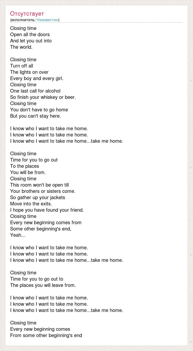 Closing time Open all the doors And let you out into The world. Closing time Turn off all The lights on over Every boy and every girl. Closing time One last call for alcohol So finish your whiskey or beer. Closing time You don't have to go home But you can't stay here. I know who I want to take me home. I know who I want to take me home. I know who I want to take me home...take me home. Closing time Time for you to go out To the places You will be from. Closing time This room won't be open till Your brothers or sisters come. So gather up your jackets Move into the exits. I hope you have found your friend. Closing time Every new beginning comes from Some other beginning's end, Yeah... I know who I want to take me home. I know who I want to take me home. I know who I want to take me home...take me home. Closing time Time for you to go out to The places you will leave from. I know who I want to take me home. I know who I want to take me home. I know who I want to take me home...take me home. Closing time Every new beginning comes From some other beginning's end