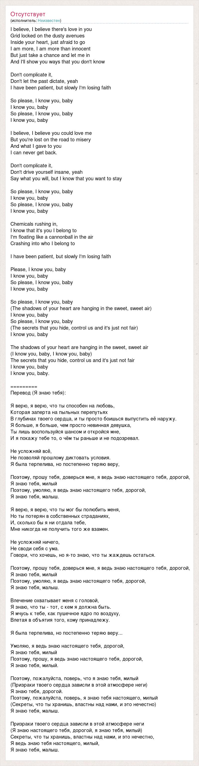 I believe, I believe there's love in you Grid locked on the dusty avenues Inside your heart, just afraid to go I am more, I am more than innocent But just take a chance and let me in And I'll show you ways that you don't know Don't complicate it, Don't let the past dictate, yeah I have been patient, but slowly I'm losing faith So please, I know you, baby I know you, baby So please, I know you, baby I know you, baby I believe, I believe you could love me But you're lost on the road to misery And what I gave to you I can never get back. Don't complicate it, Don't drive yourself insane, yeah Say what you will, but I know that you want to stay So please, I know you, baby I know you, baby So please, I know you, baby I know you, baby Chemicals rushing in, I know that it's you I belong to I'm floating like a cannonball in the air Crashing into who I belong to I have been patient, but slowly I'm losing faith Please, I know you, baby I know you, baby So please, I know you, baby I know you, baby So please, I know you, baby (The shadows of your heart are hanging in the sweet, sweet air) I know you, baby So please, I know you, baby (The secrets that you hide, control us and it's just not fair) I know you, baby The shadows of your heart are hanging in the sweet, sweet air (I know you, baby, I know you, baby) The secrets that you hide, control us and it's just not fair I know you, baby I know you, baby. ========= Перевод (Я знаю тебя): Я верю, я верю, что ты способен на любовь, Которая заперта на пыльных перепутьях В глубинах твоего сердца, и ты просто боишься выпустить её наружу. Я больше, я больше, чем просто невинная девушка, Ты лишь воспользуйся шансом и откройся мне, И я покажу тебе то, о чём ты раньше и не подозревал. Не усложняй всё, Не позволяй прошлому диктовать условия. Я была терпелива, но постепенно теряю веру, Поэтому, прошу тебя, доверься мне, я ведь знаю настоящего тебя, дорогой, Я знаю тебя, милый Поэтому, умоляю, я ведь знаю настоящего тебя, дорогой, Я знаю тебя, малыш. Я верю, я верю, что ты мог бы полюбить меня, Но ты потерян в собственных страданиях, И, сколько бы я ни отдала тебе, Мне никогда не получить того же взамен. Не усложняй ничего, Не своди себя с ума. Говори, что хочешь, но я-то знаю, что ты жаждешь остаться. Поэтому, прошу тебя, доверься мне, я ведь знаю настоящего тебя, дорогой, Я знаю тебя, милый Поэтому, умоляю, я ведь знаю настоящего тебя, дорогой, Я знаю тебя, малыш. Влечение охватывает меня с головой, Я знаю, что ты - тот, с кем я должна быть. Я мчусь к тебе, как пушечное ядро по воздуху, Влетая в объятия того, кому принадлежу. Я была терпелива, но постепенно теряю веру... Умоляю, я ведь знаю настоящего тебя, дорогой, Я знаю тебя, милый Поэтому, прошу, я ведь знаю настоящего тебя, дорогой, Я знаю тебя, милый. Поэтому, пожалуйста, поверь, что я знаю тебя, милый (Призраки твоего сердца зависли в этой атмосфере неги) Я знаю тебя, дорогой. Поэтому, пожалуйста, поверь, я знаю тебя настоящего, милый (Секреты, что ты хранишь, властны над нами, и это нечестно) Я знаю тебя, малыш. Призраки твоего сердца зависли в этой атмосфере неги (Я знаю настоящего тебя, дорогой, я знаю тебя, милый) Секреты, что ты хранишь, властны над нами, и это нечестно, Я ведь знаю тебя настоящего, милый, Я знаю тебя, малыш.