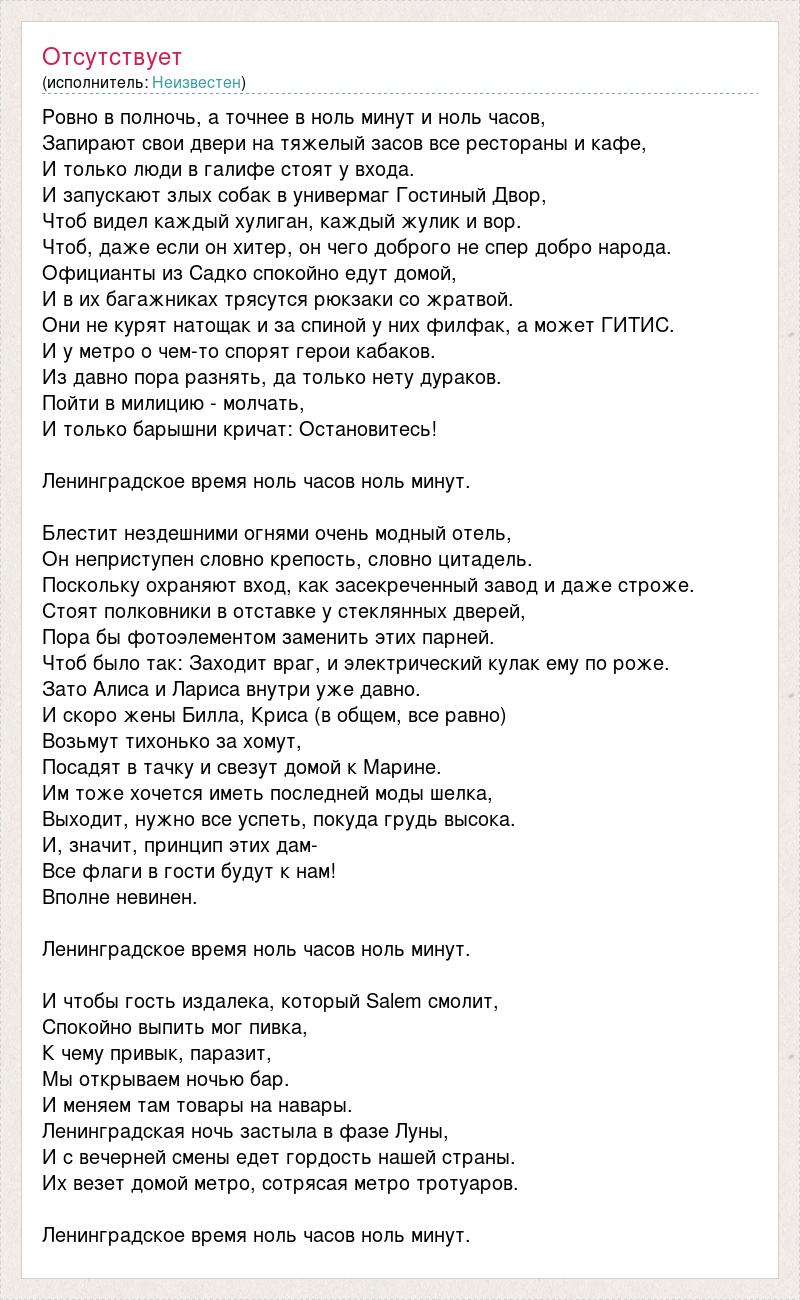 Ровно в полночь, а точнее в ноль минут и ноль часов, Запирают свои двери на тяжелый засов все рестораны и кафе, И только люди в галифе стоят у входа. И запускают злых собак в универмаг Гостиный Двор, Чтоб видел каждый хулиган, каждый жулик и вор. Чтоб, даже если он хитер, он чего доброго не спер добро народа. Официанты из Садко спокойно едут домой, И в их багажниках трясутся рюкзаки со жратвой. Они не курят натощак и за спиной у них филфак, а может ГИТИС. И у метро о чем-то спорят герои кабаков. Из давно пора разнять, да только нету дураков. Пойти в милицию - молчать, И только барышни кричат: Остановитесь! Ленинградское время ноль часов ноль минут. Блестит нездешними огнями очень модный отель, Он неприступен словно крепость, словно цитадель. Поскольку охраняют вход, как засекреченный завод и даже строже. Стоят полковники в отставке у стеклянных дверей, Пора бы фотоэлементом заменить этих парней. Чтоб было так: Заходит враг, и электрический кулак ему по роже. Зато Алиса и Лариса внутри уже давно. И скоро жены Билла, Криса (в общем, все равно) Возьмут тихонько за хомут, Посадят в тачку и свезут домой к Марине. Им тоже хочется иметь последней моды шелка, Выходит, нужно все успеть, покуда грудь высока. И, значит, принцип этих дам- Все флаги в гости будут к нам! Вполне невинен. Ленинградское время ноль часов ноль минут. И чтобы гость издалека, который Salem смолит, Спокойно выпить мог пивка, К чему привык, паразит, Мы открываем ночью бар. И меняем там товары на навары. Ленинградская ночь застыла в фазе Луны, И с вечерней смены едет гордость нашей страны. Их везет домой метро, сотрясая метро тротуаров. Ленинградское время ноль часов ноль минут.