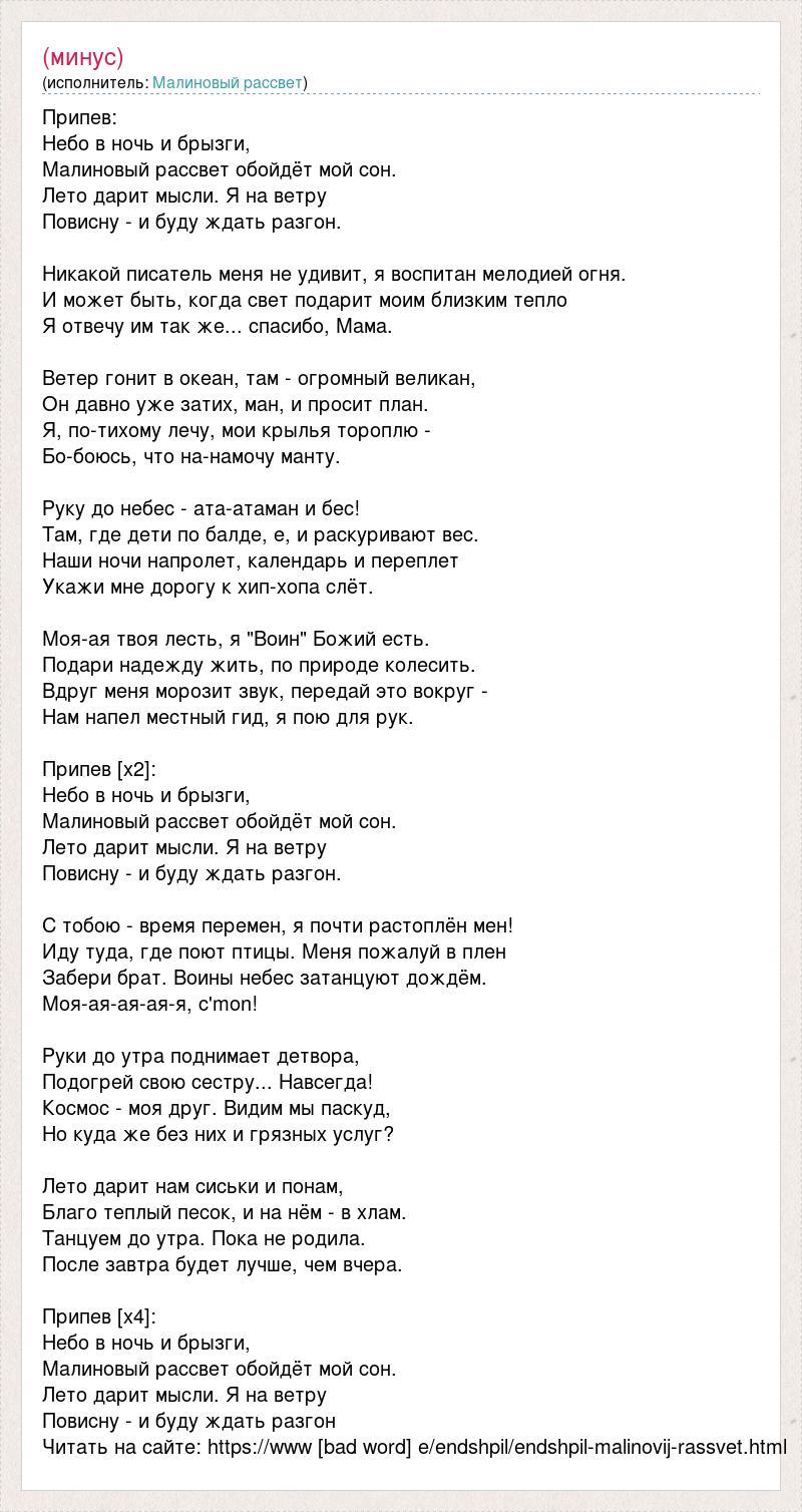 Припев: Небо в ночь и брызги, Малиновый рассвет обойдёт мой сон. Лето дарит мысли. Я на ветру Повисну - и буду ждать разгон. Никакой писатель меня не удивит, я воспитан мелодией огня. И может быть, когда свет подарит моим близким тепло Я отвечу им так же... спасибо, Мама. Ветер гонит в океан, там - огромный великан, Он давно уже затих, ман, и просит план. Я, по-тихому лечу, мои крылья тороплю - Бо-боюсь, что на-намочу манту. Руку до небес - ата-атаман и бес! Там, где дети по балде, е, и раскуривают вес. Наши ночи напролет, календарь и переплет Укажи мне дорогу к хип-хопа слёт. Моя-ая твоя лесть, я "Воин" Божий есть. Подари надежду жить, по природе колесить. Вдруг меня морозит звук, передай это вокруг - Нам напел местный гид, я пою для рук. Припев [x2]: Небо в ночь и брызги, Малиновый рассвет обойдёт мой сон. Лето дарит мысли. Я на ветру Повисну - и буду ждать разгон. С тобою - время перемен, я почти растоплён мен! Иду туда, где поют птицы. Меня пожалуй в плен Забери брат. Воины небес затанцуют дождём. Моя-ая-ая-ая-я, c'mon! Руки до утра поднимает детвора, Подогрей свою сестру... Навсегда! Космос - моя друг. Видим мы паскуд, Но куда же без них и грязных услуг? Лето дарит нам сиськи и понам, Благо теплый песок, и на нём - в хлам. Танцуем до утра. Пока не родила. После завтра будет лучше, чем вчера. Припев [x4]: Небо в ночь и брызги, Малиновый рассвет обойдёт мой сон. Лето дарит мысли. Я на ветру Повисну - и буду ждать разгон Читать на сайте: https://www [bad word] e/endshpil/endshpil-malinovij-rassvet.html