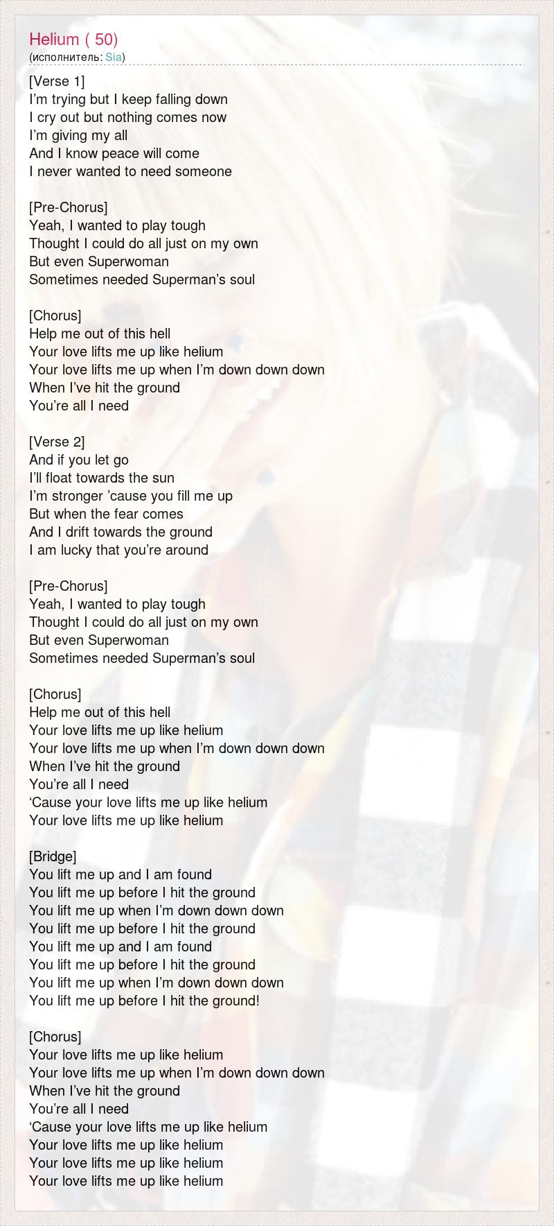 [Verse 1] I’m trying but I keep falling down I cry out but nothing comes now I’m giving my all And I know peace will come I never wanted to need someone [Pre-Chorus] Yeah, I wanted to play tough Thought I could do all just on my own But even Superwoman Sometimes needed Superman’s soul [Chorus] Help me out of this hell Your love lifts me up like helium Your love lifts me up when I’m down down down When I’ve hit the ground You’re all I need [Verse 2] And if you let go I’ll float towards the sun I’m stronger ’cause you fill me up But when the fear comes And I drift towards the ground I am lucky that you’re around [Pre-Chorus] Yeah, I wanted to play tough Thought I could do all just on my own But even Superwoman Sometimes needed Superman’s soul [Chorus] Help me out of this hell Your love lifts me up like helium Your love lifts me up when I’m down down down When I’ve hit the ground You’re all I need ‘Cause your love lifts me up like helium Your love lifts me up like helium [Bridge] You lift me up and I am found You lift me up before I hit the ground You lift me up when I’m down down down You lift me up before I hit the ground You lift me up and I am found You lift me up before I hit the ground You lift me up when I’m down down down You lift me up before I hit the ground! [Chorus] Your love lifts me up like helium Your love lifts me up when I’m down down down When I’ve hit the ground You’re all I need ‘Cause your love lifts me up like helium Your love lifts me up like helium Your love lifts me up like helium Your love lifts me up like helium