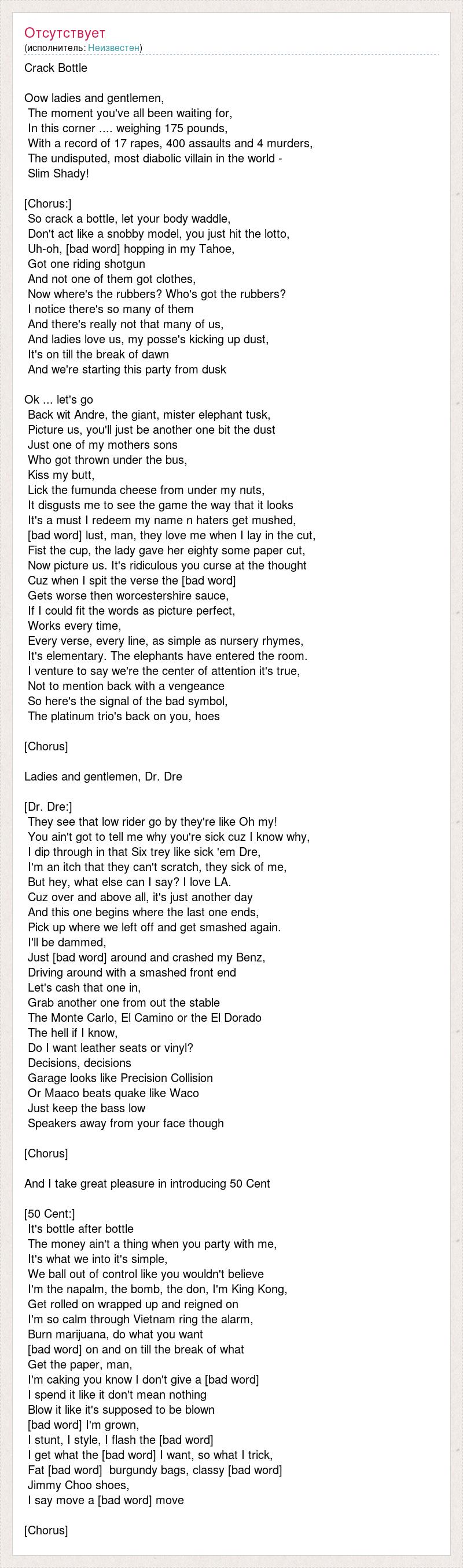 Crack Bottle Oow ladies and gentlemen, The moment you've all been waiting for, In this corner .... weighing 175 pounds, With a record of 17 rapes, 400 assaults and 4 murders, The undisputed, most diabolic villain in the world - Slim Shady! [Chorus:] So crack a bottle, let your body waddle, Don't act like a snobby model, you just hit the lotto, Uh-oh, [bad word] hopping in my Tahoe, Got one riding shotgun Аnd not one of them got clothes, Now where's the rubbers? Who's got the rubbers? I notice there's so many of them And there's really not that many of us, And ladies love us, my posse's kicking up dust, It's on till the break of dawn And we're starting this party from dusk Ok ... let's go Back wit Andre, the giant, mister elephant tusk, Picture us, you'll just be another one bit the dust Just one of my mothers sons Who got thrown under the bus, Kiss my butt, Lick the fumunda cheese from under my nuts, It disgusts me to see the game the way that it looks It's a must I redeem my name n haters get mushed, [bad word] lust, man, they love me when I lay in the cut, Fist the cup, the lady gave her eighty some paper cut, Now picture us. It's ridiculous you curse at the thought Cuz when I spit the verse the [bad word] Gets worse then worcestershire sauce, If I could fit the words as picture perfect, Works every time, Every verse, every line, as simple as nursery rhymes, It's elementary. The elephants have entered the room. I venture to say we're the center of attention it's true, Not to mention back with a vengeance So here's the signal of the bad symbol, The platinum trio's back on you, hoes [Chorus] Ladies and gentlemen, Dr. Dre [Dr. Dre:] They see that low rider go by they're like Oh my! You ain't got to tell me why you're sick cuz I know why, I dip through in that Six trey like sick 'em Dre, I'm an itch that they can't scratch, they sick of me, But hey, what else can I say? I love LA. Cuz over and above all, it's just another day And this one begins where the last one ends, Pick up where we left off and get smashed again. I'll be dammed, Just [bad word] around and crashed my Benz, Driving around with a smashed front end Let's cash that one in, Grab another one from out the stable The Monte Carlo, El Camino or the El Dorado The hell if I know, Do I want leather seats or vinyl? Decisions, decisions Garage looks like Precision Collision Or Maaco beats quake like Waco Just keep the bass low Speakers away from your face though [Chorus] And I take great pleasure in introducing 50 Cent [50 Cent:] It's bottle after bottle The money ain't a thing when you party with me, It's what we into it's simple, We ball out of control like you wouldn't believe I'm the napalm, the bomb, the don, I'm King Kong, Get rolled on wrapped up and reigned on I'm so calm through Vietnam ring the alarm, Burn marijuana, do what you want [bad word] on and on till the break of what Get the paper, man, I'm caking you know I don't give a [bad word] I spend it like it don't mean nothing Blow it like it's supposed to be blown [bad word] I'm grown, I stunt, I style, I flash the [bad word] I get what the [bad word] I want, so what I trick, Fat [bad word] burgundy bags, classy [bad word] Jimmy Choo shoes, I say move a [bad word] move [Chorus]
