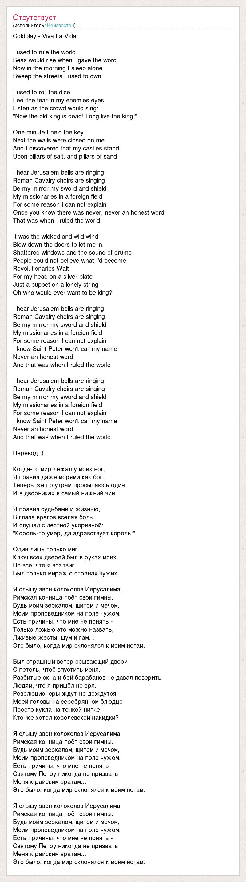 Coldplay - Viva La Vida I used to rule the world Seas would rise when I gave the word Now in the morning I sleep alone Sweep the streets I used to own I used to roll the dice Feel the fear in my enemies eyes Listen as the crowd would sing: "Now the old king is dead! Long live the king!" One minute I held the key Next the walls were closed on me And I discovered that my castles stand Upon pillars of salt, and pillars of sand I hear Jerusalem bells are ringing Roman Cavalry choirs are singing Be my mirror my sword and shield My missionaries in a foreign field For some reason I can not explain Once you know there was never, never an honest word That was when I ruled the world It was the wicked and wild wind Blew down the doors to let me in. Shattered windows and the sound of drums People could not believe what I'd become Revolutionaries Wait For my head on a silver plate Just a puppet on a lonely string Oh who would ever want to be king? I hear Jerusalem bells are ringing Roman Cavalry choirs are singing Be my mirror my sword and shield My missionaries in a foreign field For some reason I can not explain I know Saint Peter won't call my name Never an honest word And that was when I ruled the world I hear Jerusalem bells are ringing Roman Cavalry choirs are singing Be my mirror my sword and shield My missionaries in a foreign field For some reason I can not explain I know Saint Peter won't call my name Never an honest word And that was when I ruled the world. Перевод :) Когда-то мир лежал у моих ног, Я правил даже морями как бог. Теперь же по утрам просыпаюсь один И в дворниках я самый нижний чин. Я правил судьбами и жизнью, В глаза врагов вселяя боль, И слушал с лестной укоризной: "Король-то умер, да здравствует король!" Один лишь только миг Ключ всех дверей был в руках моих Но всё, что я воздвиг Был только мираж о странах чужих. Я слышу звон колоколов Иерусалима, Римская конница поёт свои гимны. Будь моим зеркалом, щитом и мечом, Моим проповедником на поле чужом. Есть причины, что мне не понять - Только ложью это можно назвать, Лживые жесты, шум и гам… Это было, когда мир склонялся к моим ногам. Был страшный ветер срывающий двери С петель, чтоб впустить меня. Разбитые окна и бой барабанов не давал поверить Людям, что я пришёл не зря. Революционеры ждут-не дождутся Моей головы на серебрянном блюдце Просто кукла на тонкой нитке - Кто же хотел королевской накидки? Я слышу звон колоколов Иерусалима, Римская конница поёт свои гимны. Будь моим зеркалом, щитом и мечом, Моим проповедником на поле чужом. Есть причины, что мне не понять - Святому Петру никогда не призвать Меня к райским вратам... Это было, когда мир склонялся к моим ногам. Я слышу звон колоколов Иерусалима, Римская конница поёт свои гимны. Будь моим зеркалом, щитом и мечом, Моим проповедником на поле чужом. Есть причины, что мне не понять - Святому Петру никогда не призвать Меня к райским вратам... Это было, когда мир склонялся к моим ногам.