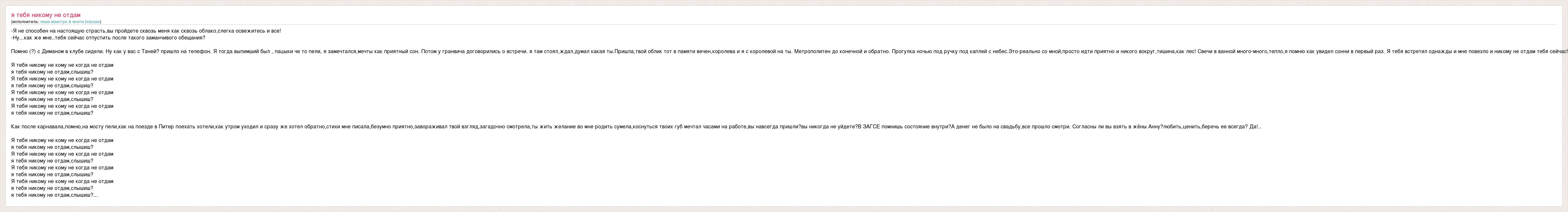 -Я не способен на настоящую страсть,вы пройдете сквозь меня как сквозь облако,слегка освежитесь и все! -Ну...как же мне..тебя сейчас отпустить после такого заманчивого обещания? Помню (?) с Диманом в клубе сидели. Ну как у вас с Таней? пришло на телефон. Я тогда выпимший был , пацыки че то пели, я замечтался,мечты как приятный сон. Потом у гранвича договорились о встречи. я там стоял,ждал,думал какая ты.Пришла,твой облик тот в памяти вечен,королева и я с королевой на ты. Метрополитен до конечной и обратно. Прогулка ночью под ручку под каплей с небес.Это-реально со мной,просто идти приятно и никого вокруг,тишина,как лес! Свечи в ванной много-много,тепло,я помню как увидел сонни в первый раз. Я тебя встретил однажды и мне повезло и никому не отдам тебя сейчас! Я тебя никому не кому не когда не отдам я тебя никому не отдам,слышиш? Я тебя никому не кому не когда не отдам я тебя никому не отдам,слышиш? Я тебя никому не кому не когда не отдам я тебя никому не отдам,слышиш? Я тебя никому не кому не когда не отдам я тебя никому не отдам,слышиш? Как после карнавала,помню,на мосту пели,как на поезде в Питер поехать хотели,как утром уходил и сразу же хотел обратно,стихи мне писала,безумно приятно,завораживал твой взгляд,загадочно смотрела,ты жить желание во мне родить сумела,коснуться твоих губ мечтал часами на работе,вы навсегда пришли?вы никогда не уйдете?В ЗАГСЕ помнишь состояние внутри?А денег не было на свадьбу,все прошло смотри. Согласны ли вы взять в жёны Анну?любить,ценить,беречь ее всегда? Да!.. Я тебя никому не кому не когда не отдам я тебя никому не отдам,слышиш? Я тебя никому не кому не когда не отдам я тебя никому не отдам,слышиш? Я тебя никому не кому не когда не отдам я тебя никому не отдам,слышиш? Я тебя никому не кому не когда не отдам я тебя никому не отдам,слышиш? я тебя никому не отдам,слышиш?...