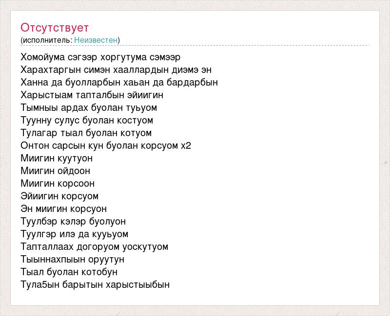 Хомойума сэгээр хоргутума сэмээр Харахтаргын симэн хааллардын диэмэ эн Ханна да буолларбын хаьан да бардарбын Харыстыам тапталбын эйиигин Тымныы ардах буолан туьуом Туунну сулус буолан костуом Тулагар тыал буолан котуом Онтон сарсын кун буолан корсуом х2 Миигин куутуон Миигин ойдоон Миигин корсоон Эйиигин корсуом Эн миигин корсуон Туулбэр кэлэр буолуон Туулгэр илэ да кууьуом Тапталлаах догоруом уоскутуом Тыыннахпыын оруутун Тыал буолан котобун Тула5ын барытын харыстыыбын