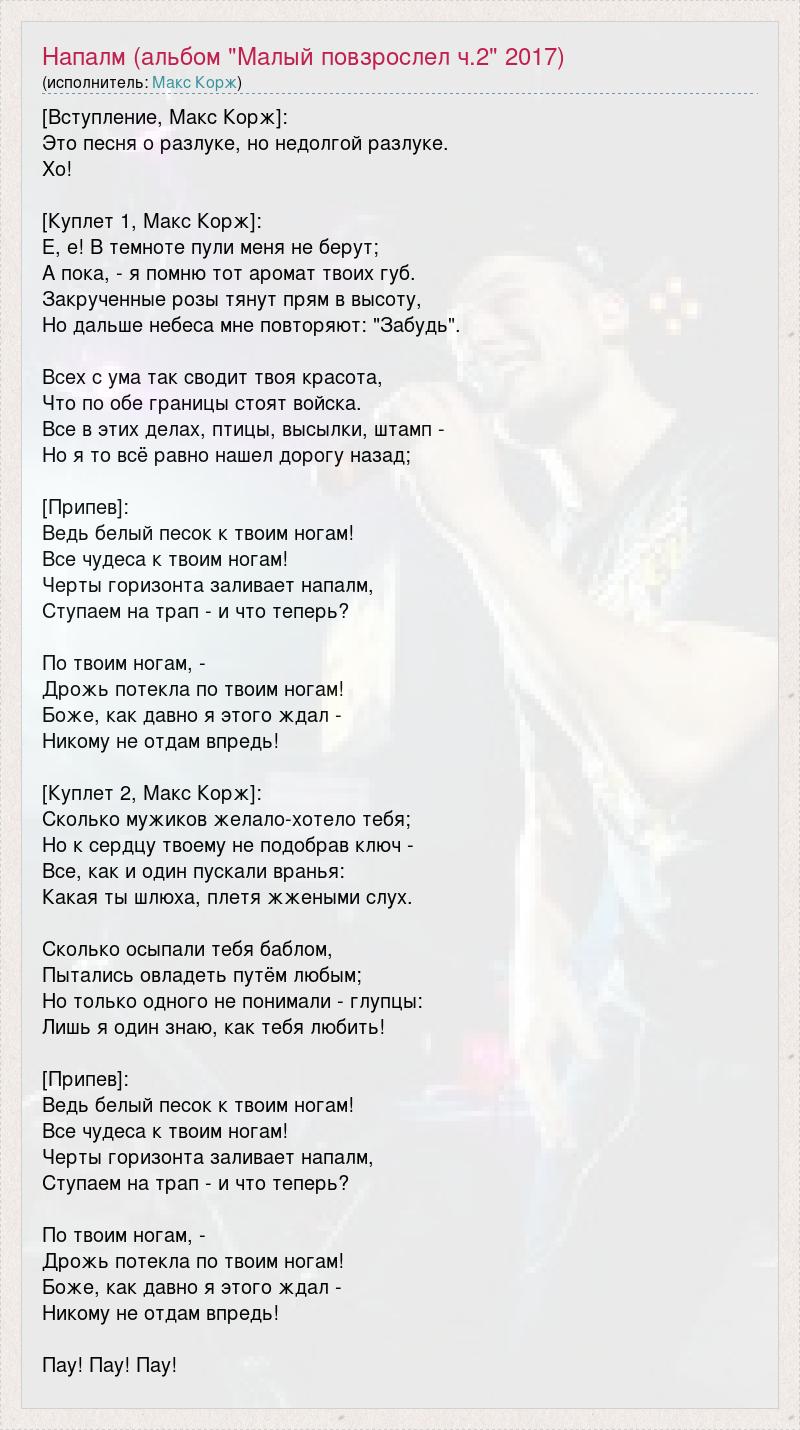 [Вступление, Макс Корж]: Это песня о разлуке, но недолгой разлуке. Хо! [Куплет 1, Макс Корж]: Е, е! В темноте пули меня не берут; А пока, - я помню тот аромат твоих губ. Закрученные розы тянут прям в высоту, Но дальше небеса мне повторяют: "Забудь". Всех с ума так сводит твоя красота, Что по обе границы стоят войска. Все в этих делах, птицы, высылки, штамп - Но я то всё равно нашел дорогу назад; [Припев]: Ведь белый песок к твоим ногам! Все чудеса к твоим ногам! Черты горизонта заливает напалм, Ступаем на трап - и что теперь? По твоим ногам, - Дрожь потекла по твоим ногам! Боже, как давно я этого ждал - Никому не отдам впредь! [Куплет 2, Макс Корж]: Сколько мужиков желало-хотело тебя; Но к сердцу твоему не подобрав ключ - Все, как и один пускали вранья: Какая ты шлюха, плетя жжеными слух. Сколько осыпали тебя баблом, Пытались овладеть путём любым; Но только одного не понимали - глупцы: Лишь я один знаю, как тебя любить! [Припев]: Ведь белый песок к твоим ногам! Все чудеса к твоим ногам! Черты горизонта заливает напалм, Ступаем на трап - и что теперь? По твоим ногам, - Дрожь потекла по твоим ногам! Боже, как давно я этого ждал - Никому не отдам впредь! Пау! Пау! Пау!