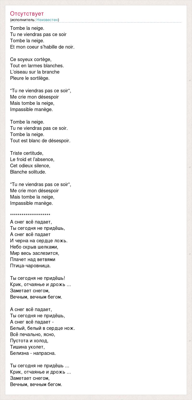 Tombe la neige. Tu ne viendras pas ce soir Tombe la neige. Et mon coeur s’habille de noir. Ce soyeux cortège, Tout en larmes blanches. L’oiseau sur la branche Pleure le sortilège. “Tu ne viendras pas ce soir”, Me crie mon désespoir Mais tombe la neige, Impassible manège. Tombe la neige. Tu ne viendras pas ce soir. Tombe la neige. Tout est blanc de désespoir. Triste certitude, Le froid et l’absence, Cet odieux silence, Blanche solitude. “Tu ne viendras pas ce soir”, Me crie mon désespoir Mais tombe la neige, Impassible manège. ********************* А снег всё падает, Ты сегодня не придёшь, А снег всё падает И черна на сердце ложь. Небо скрыв шелками, Мир весь заслезится, Плачет над ветвями Птица-чаровница. Ты сегодня не придёшь! Крик, отчаянье и дрожь ... Заметает снегом, Вечным, вечным бегом. А снег всё падает, Ты сегодня не придёшь, А снег всё падает - Белый, белый в сердце нож. Всё печально, ясно, Пустота и холод, Тишина уколет, Белизна - напрасна. Ты сегодня не придёшь ... Крик, отчаянье и дрожь ... Заметает снегом, Вечным, вечным бегом.