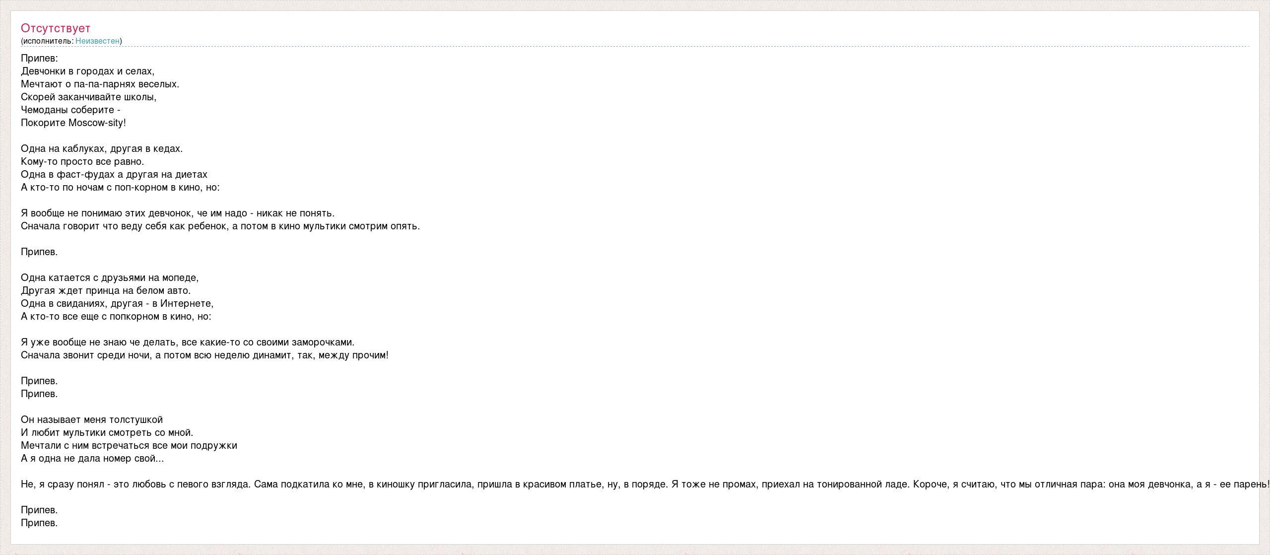 Припев: Девчонки в городах и селах, Мечтают о па-па-парнях веселых. Скорей заканчивайте школы, Чемоданы соберите - Покорите Moscow-sity! Одна на каблуках, другая в кедах. Кому-то просто все равно. Одна в фаст-фудах а другая на диетах А кто-то по ночам с поп-корном в кино, но: Я вообще не понимаю этих девчонок, че им надо - никак не понять. Сначала говорит что веду себя как ребенок, а потом в кино мультики смотрим опять. Припев. Одна катается с друзьями на мопеде, Другая ждет принца на белом авто. Одна в свиданиях, другая - в Интернете, А кто-то все еще с попкорном в кино, но: Я уже вообще не знаю че делать, все какие-то со своими заморочками. Сначала звонит среди ночи, а потом всю неделю динамит, так, между прочим! Припев. Припев. Он называет меня толстушкой И любит мультики смотреть со мной. Мечтали с ним встречаться все мои подружки А я одна не дала номер свой... Не, я сразу понял - это любовь с певого взгляда. Сама подкатила ко мне, в киношку пригласила, пришла в красивом платье, ну, в поряде. Я тоже не промах, приехал на тонированной ладе. Короче, я считаю, что мы отличная пара: она моя девчонка, а я - ее парень! Припев. Припев.