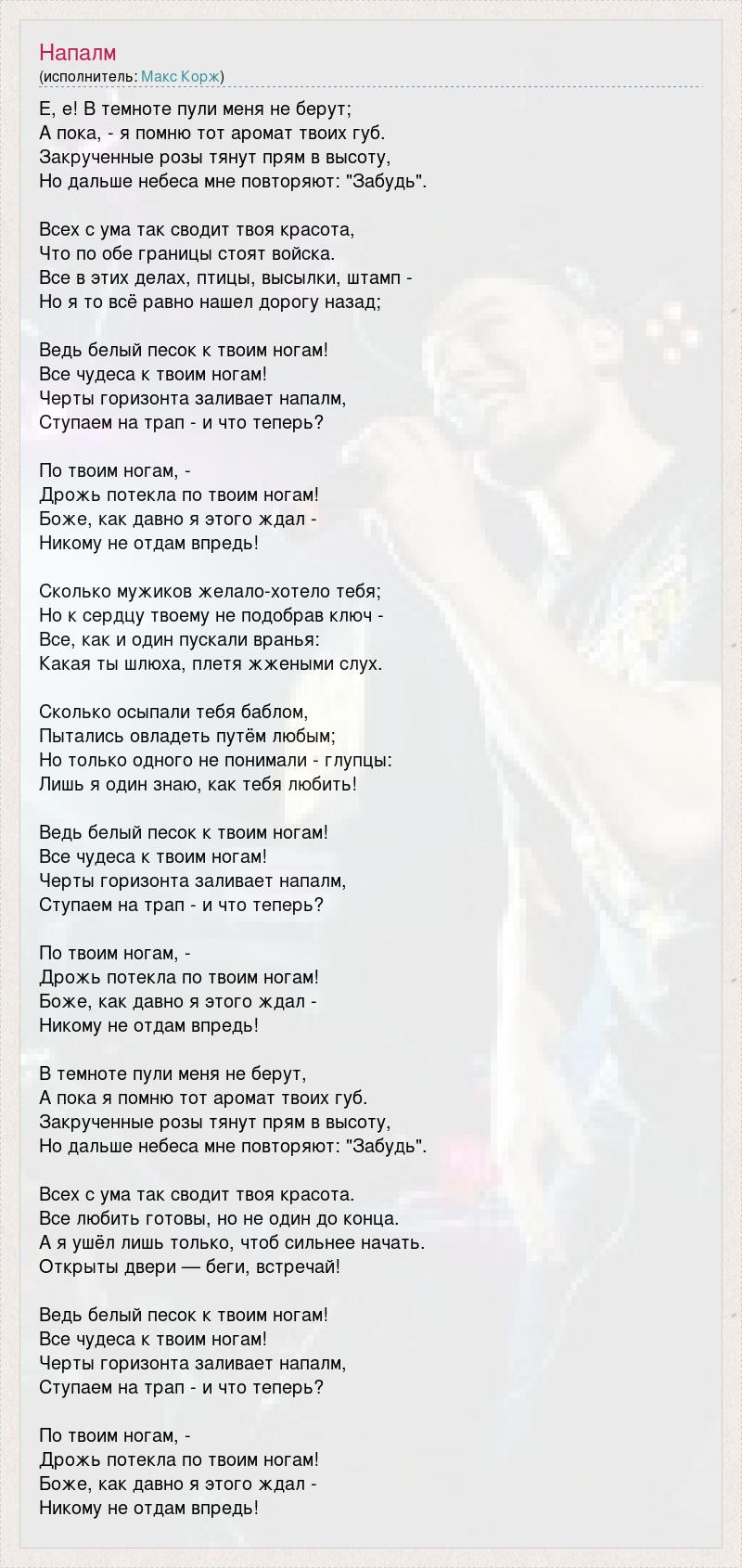 Е, е! В темноте пули меня не берут; А пока, - я помню тот аромат твоих губ. Закрученные розы тянут прям в высоту, Но дальше небеса мне повторяют: "Забудь". Всех с ума так сводит твоя красота, Что по обе границы стоят войска. Все в этих делах, птицы, высылки, штамп - Но я то всё равно нашел дорогу назад; Ведь белый песок к твоим ногам! Все чудеса к твоим ногам! Черты горизонта заливает напалм, Ступаем на трап - и что теперь? По твоим ногам, - Дрожь потекла по твоим ногам! Боже, как давно я этого ждал - Никому не отдам впредь! Сколько мужиков желало-хотело тебя; Но к сердцу твоему не подобрав ключ - Все, как и один пускали вранья: Какая ты шлюха, плетя жжеными слух. Сколько осыпали тебя баблом, Пытались овладеть путём любым; Но только одного не понимали - глупцы: Лишь я один знаю, как тебя любить! Ведь белый песок к твоим ногам! Все чудеса к твоим ногам! Черты горизонта заливает напалм, Ступаем на трап - и что теперь? По твоим ногам, - Дрожь потекла по твоим ногам! Боже, как давно я этого ждал - Никому не отдам впредь! В темноте пули меня не берут, А пока я помню тот аромат твоих губ. Закрученные розы тянут прям в высоту, Но дальше небеса мне повторяют: "Забудь". Всех с ума так сводит твоя красота. Все любить готовы, но не один до конца. А я ушёл лишь только, чтоб сильнее начать. Открыты двери — беги, встречай! Ведь белый песок к твоим ногам! Все чудеса к твоим ногам! Черты горизонта заливает напалм, Ступаем на трап - и что теперь? По твоим ногам, - Дрожь потекла по твоим ногам! Боже, как давно я этого ждал - Никому не отдам впредь!