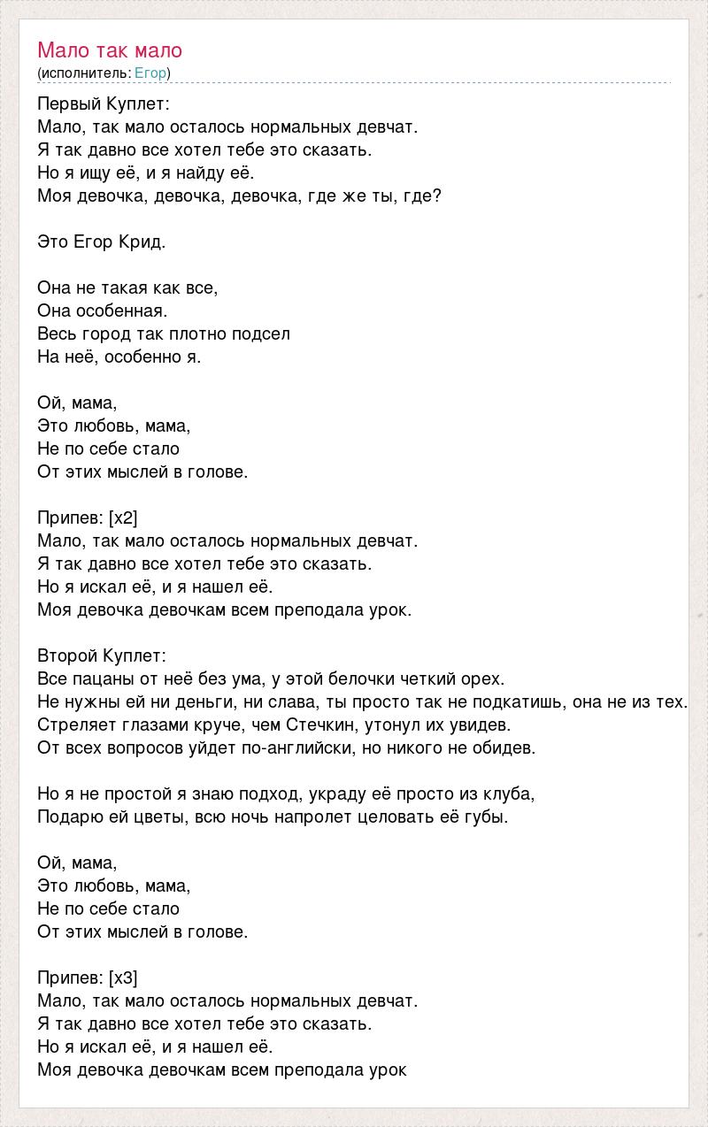 Первый Куплет: Мало, так мало осталось нормальных девчат. Я так давно все хотел тебе это сказать. Но я ищу её, и я найду её. Моя девочка, девочка, девочка, где же ты, где? Это Егор Крид. Она не такая как все, Она особенная. Весь город так плотно подсел На неё, особенно я. Ой, мама, Это любовь, мама, Не по себе стало От этих мыслей в голове. Припев: [х2] Мало, так мало осталось нормальных девчат. Я так давно все хотел тебе это сказать. Но я искал её, и я нашел её. Моя девочка девочкам всем преподала урок. Второй Куплет: Все пацаны от неё без ума, у этой белочки четкий орех. Не нужны ей ни деньги, ни слава, ты просто так не подкатишь, она не из тех. Стреляет глазами круче, чем Стечкин, утонул их увидев. От всех вопросов уйдет по-английски, но никого не обидев. Но я не простой я знаю подход, украду её просто из клуба, Подарю ей цветы, всю ночь напролет целовать её губы. Ой, мама, Это любовь, мама, Не по себе стало От этих мыслей в голове. Припев: [х3] Мало, так мало осталось нормальных девчат. Я так давно все хотел тебе это сказать. Но я искал её, и я нашел её. Моя девочка девочкам всем преподала урок