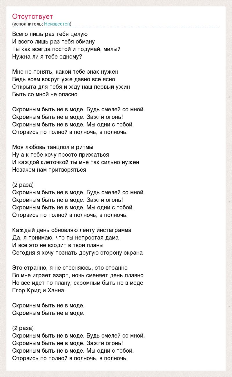 Всего лишь раз тебя целую И всего лишь раз тебя обману Ты как всегда постой и подумай, милый Нужна ли я тебе одному? Мне не понять, какой тебе знак нужен Ведь всем вокруг уже давно все ясно Открыта для тебя и жду наш первый ужин Быть со мной не опасно Скромным быть не в моде. Будь смелей со мной. Скромным быть не в моде. Зажги огонь! Скромным быть не в моде. Мы одни с тобой. Оторвись по полной в полночь, в полночь. Моя любовь танцпол и ритмы Ну а к тебе хочу просто прижаться И каждой клеточкой ты мне так сильно нужен Незачем нам притворяться (2 раза) Скромным быть не в моде. Будь смелей со мной. Скромным быть не в моде. Зажги огонь! Скромным быть не в моде. Мы одни с тобой. Оторвись по полной в полночь, в полночь. Каждый день обновляю ленту инстаграмма Да, я понимаю, что ты непростая дама И все это не входит в твои планы Сегодня я хочу познать другую сторону экрана Это странно, я не стесняюсь, это странно Во мне играет азарт, ночь сменяет день плавно Но все идет по плану, скромным быть не в моде Егор Крид и Ханна. Скромным быть не в моде. Скромным быть не в моде. (2 раза) Скромным быть не в моде. Будь смелей со мной. Скромным быть не в моде. Зажги огонь! Скромным быть не в моде. Мы одни с тобой. Оторвись по полной в полночь, в полночь.
