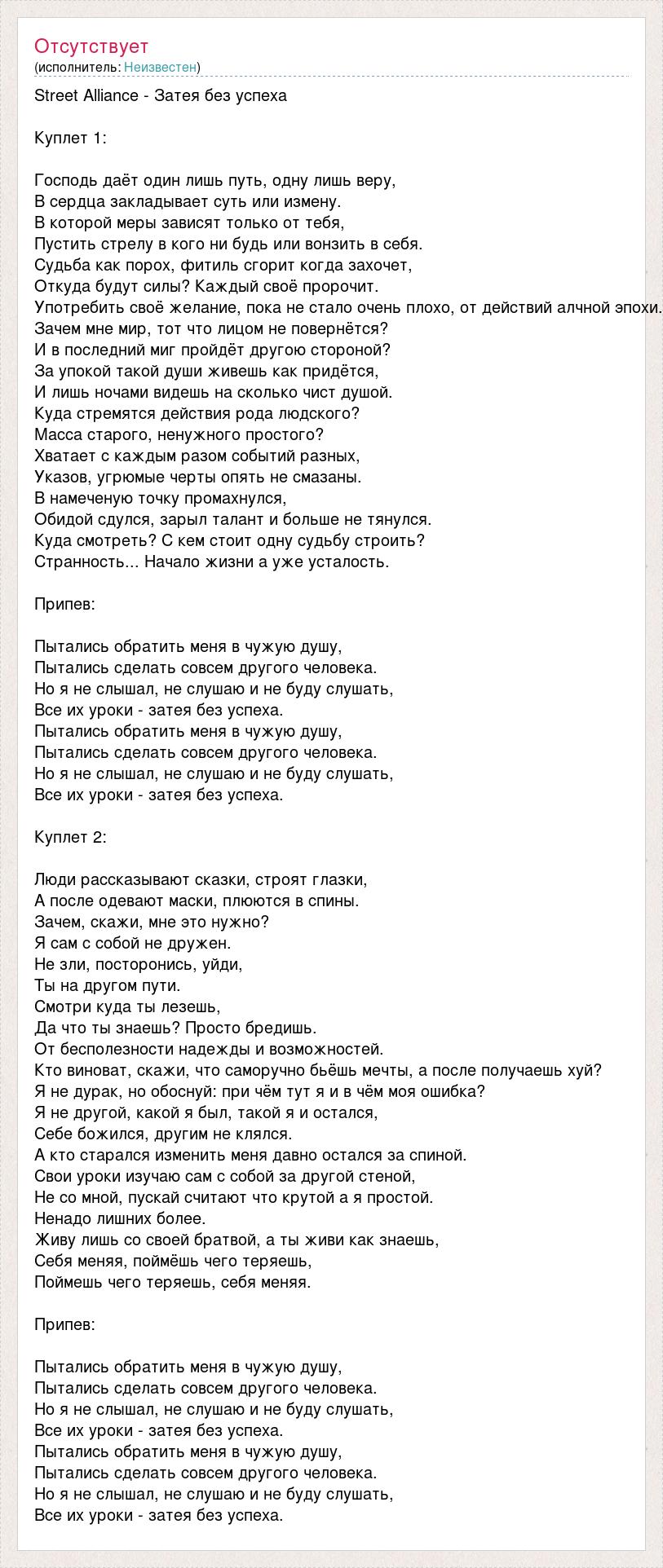 Street Alliance - Затея без успеха Куплет 1: Господь даёт один лишь путь, одну лишь веру, В сердца закладывает суть или измену. В которой меры зависят только от тебя, Пустить стрелу в кого ни будь или вонзить в себя. Судьба как порох, фитиль сгорит когда захочет, Откуда будут силы? Каждый своё пророчит. Употребить своё желание, пока не стало очень плохо, от действий алчной эпохи. Зачем мне мир, тот что лицом не повернётся? И в последний миг пройдёт другою стороной? За упокой такой души живешь как придётся, И лишь ночами видешь на сколько чист душой. Куда стремятся действия рода людского? Масса старого, ненужного простого? Хватает с каждым разом событий разных, Указов, угрюмые черты опять не смазаны. В намеченую точку промахнулся, Обидой сдулся, зарыл талант и больше не тянулся. Куда смотреть? С кем стоит одну судьбу строить? Странность... Начало жизни а уже усталость. Припев: Пытались обратить меня в чужую душу, Пытались сделать совсем другого человека. Но я не слышал, не слушаю и не буду слушать, Все их уроки - затея без успеха. Пытались обратить меня в чужую душу, Пытались сделать совсем другого человека. Но я не слышал, не слушаю и не буду слушать, Все их уроки - затея без успеха. Куплет 2: Люди рассказывают сказки, строят глазки, А после одевают маски, плюются в спины. Зачем, скажи, мне это нужно? Я сам с собой не дружен. Не зли, посторонись, уйди, Ты на другом пути. Смотри куда ты лезешь, Да что ты знаешь? Просто бредишь. От бесполезности надежды и возможностей. Кто виноват, скажи, что саморучно бьёшь мечты, а после получаешь хуй? Я не дурак, но обоснуй: при чём тут я и в чём моя ошибка? Я не другой, какой я был, такой я и остался, Себе божился, другим не клялся. А кто старался изменить меня давно остался за спиной. Свои уроки изучаю сам с собой за другой стеной, Не со мной, пускай считают что крутой а я простой. Ненадо лишних более. Живу лишь со своей братвой, а ты живи как знаешь, Себя меняя, поймёшь чего теряешь, Поймешь чего теряешь, себя меняя. Припев: Пытались обратить меня в чужую душу, Пытались сделать совсем другого человека. Но я не слышал, не слушаю и не буду слушать, Все их уроки - затея без успеха. Пытались обратить меня в чужую душу, Пытались сделать совсем другого человека. Но я не слышал, не слушаю и не буду слушать, Все их уроки - затея без успеха.