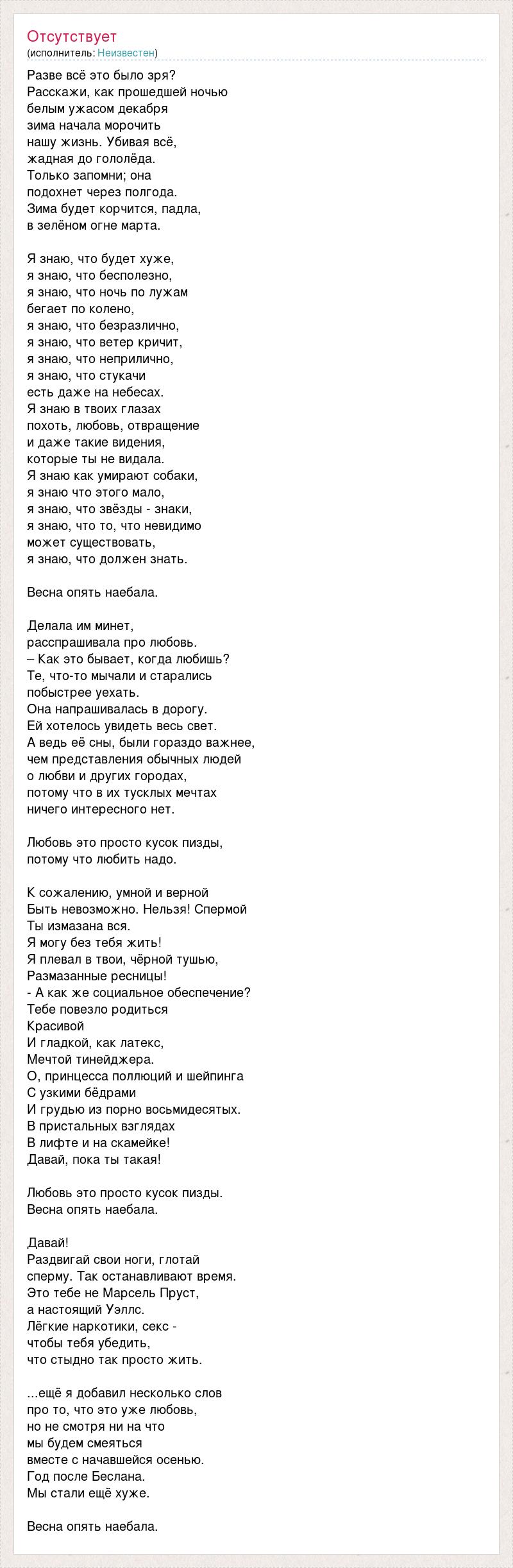 Разве всё это было зря? Расскажи, как прошедшей ночью белым ужасом декабря зима начала морочить нашу жизнь. Убивая всё, жадная до гололёда. Только запомни; она подохнет через полгода. Зима будет корчится, падла, в зелёном огне марта. Я знаю, что будет хуже, я знаю, что бесполезно, я знаю, что ночь по лужам бегает по колено, я знаю, что безразлично, я знаю, что ветер кричит, я знаю, что неприлично, я знаю, что стукачи есть даже на небесах. Я знаю в твоих глазах похоть, любовь, отвращение и даже такие видения, которые ты не видала. Я знаю как умирают собаки, я знаю что этого мало, я знаю, что звёзды - знаки, я знаю, что то, что невидимо может существовать, я знаю, что должен знать. Весна опять наебала. Делала им минет, расспрашивала про любовь. – Как это бывает, когда любишь? Те, что-то мычали и старались побыстрее уехать. Она напрашивалась в дорогу. Ей хотелось увидеть весь свет. А ведь её сны, были гораздо важнее, чем представления обычных людей о любви и других городах, потому что в их тусклых мечтах ничего интересного нет. Любовь это просто кусок пизды, потому что любить надо. К сожалению, умной и верной Быть невозможно. Нельзя! Спермой Ты измазана вся. Я могу без тебя жить! Я плевал в твои, чёрной тушью, Размазанные ресницы! - А как же социальное обеспечение? Тебе повезло родиться Красивой И гладкой, как латекс, Мечтой тинейджера. О, принцесса поллюций и шейпинга С узкими бёдрами И грудью из порно восьмидесятых. В пристальных взглядах В лифте и на скамейке! Давай, пока ты такая! Любовь это просто кусок пизды. Весна опять наебала. Давай! Раздвигай свои ноги, глотай сперму. Так останавливают время. Это тебе не Марсель Пруст, а настоящий Уэллс. Лёгкие наркотики, секс - чтобы тебя убедить, что стыдно так просто жить. ...ещё я добавил несколько слов про то, что это уже любовь, но не смотря ни на что мы будем смеяться вместе с начавшейся осенью. Год после Беслана. Мы стали ещё хуже. Весна опять наебала.