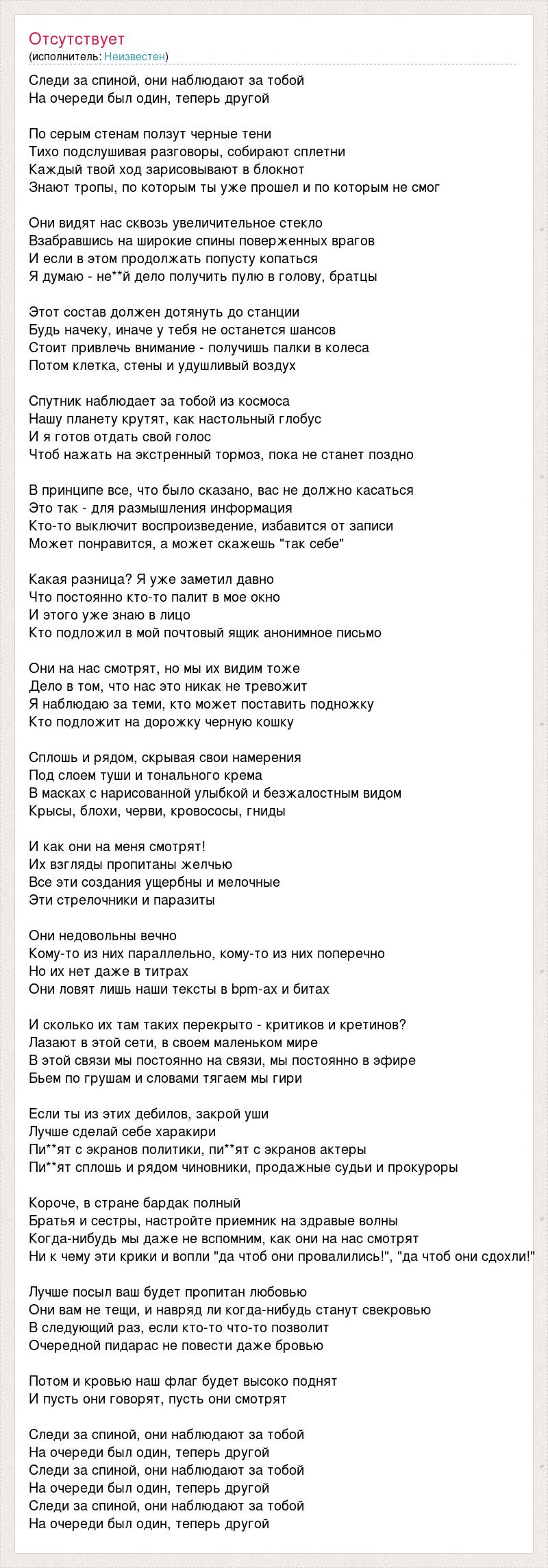 Следи за спиной, они наблюдают за тобой На очереди был один, теперь другой По серым стенам ползут черные тени Тихо подслушивая разговоры, собирают сплетни Каждый твой ход зарисовывают в блокнот Знают тропы, по которым ты уже прошел и по которым не смог Они видят нас сквозь увеличительное стекло Взабравшись на широкие спины поверженных врагов И если в этом продолжать попусту копаться Я думаю - не**й дело получить пулю в голову, братцы Этот состав должен дотянуть до станции Будь начеку, иначе у тебя не останется шансов Стоит привлечь внимание - получишь палки в колеса Потом клетка, стены и удушливый воздух Спутник наблюдает за тобой из космоса Нашу планету крутят, как настольный глобус И я готов отдать свой голос Чтоб нажать на экстренный тормоз, пока не станет поздно В принципе все, что было сказано, вас не должно касаться Это так - для размышления информация Кто-то выключит воспроизведение, избавится от записи Может понравится, а может скажешь "так себе" Какая разница? Я уже заметил давно Что постоянно кто-то палит в мое окно И этого уже знаю в лицо Кто подложил в мой почтовый ящик анонимное письмо Они на нас смотрят, но мы их видим тоже Дело в том, что нас это никак не тревожит Я наблюдаю за теми, кто может поставить подножку Кто подложит на дорожку черную кошку Сплошь и рядом, скрывая свои намерения Под слоем туши и тонального крема В масках с нарисованной улыбкой и безжалостным видом Крысы, блохи, черви, кровососы, гниды И как они на меня смотрят! Их взгляды пропитаны желчью Все эти создания ущербны и мелочные Эти стрелочники и паразиты Они недовольны вечно Кому-то из них параллельно, кому-то из них поперечно Но их нет даже в титрах Они ловят лишь наши тексты в bpm-ах и битах И сколько их там таких перекрыто - критиков и кретинов? Лазают в этой сети, в своем маленьком мире В этой связи мы постоянно на связи, мы постоянно в эфире Бьем по грушам и словами тягаем мы гири Если ты из этих дебилов, закрой уши Лучше сделай себе харакири Пи**ят с экранов политики, пи**ят с экранов актеры Пи**ят сплошь и рядом чиновники, продажные судьи и прокуроры Короче, в стране бардак полный Братья и сестры, настройте приемник на здравые волны Когда-нибудь мы даже не вспомним, как они на нас смотрят Ни к чему эти крики и вопли "да чтоб они провалились!", "да чтоб они сдохли!" Лучше посыл ваш будет пропитан любовью Они вам не тещи, и навряд ли когда-нибудь станут свекровью В следующий раз, если кто-то что-то позволит Очередной пидарас не повести даже бровью Потом и кровью наш флаг будет высоко поднят И пусть они говорят, пусть они смотрят Следи за спиной, они наблюдают за тобой На очереди был один, теперь другой Следи за спиной, они наблюдают за тобой На очереди был один, теперь другой Следи за спиной, они наблюдают за тобой На очереди был один, теперь другой