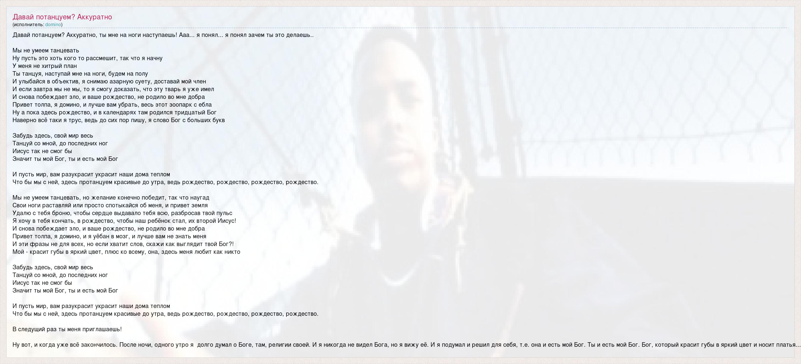 Давай потанцуем? Аккуратно, ты мне на ноги наступаешь! Ааа... я понял... я понял зачем ты это делаешь.. Мы не умеем танцевать Ну пусть это хоть кого то рассмешит, так что я начну У меня не хитрый план Ты танцуя, наступай мне на ноги, будем на полу И улыбайся в объектив, я снимаю азарную суету, доставай мой член И если завтра мы не мы, то я смогу доказать, что эту тварь я уже имел И снова побеждает зло, и ваше рождество, не родило во мне добра Привет толпа, я домино, и лучше вам убрать, весь этот зоопарк с ебла Ну а пока здесь рождество, и в календарях там родился тридцатый Бог Наверно всё таки я трус, ведь до сих пор пишу, я слово Бог с больших букв Забудь здесь, свой мир весь Танцуй со мной, до последних ног Иисус так не смог бы Значит ты мой Бог, ты и есть мой Бог И пусть мир, вам разукрасит украсит наши дома теплом Что бы мы с ней, здесь протанцуем красивые до утра, ведь рождество, рождество, рождество, рождество. Мы не умеем танцевать, но желание конечно победит, так что наугад Свои ноги раставляй или просто спотыкайся об меня, и привет земля Удалю с тебя броню, чтобы сердце выдавало тебя всю, разбросав твой пульс Я хочу в тебя кончать, в рождество, чтобы наш ребёнок стал, их второй Иисус! И снова побеждает зло, и ваше рождество, не родило во мне добра Привет толпа, я домино, и я уёбан в мозг, и лучше вам не знать меня И эти фразы не для всех, но если хватит слов, скажи как выглядит твой Бог?! Мой - красит губы в яркий цвет, плюс ко всему, она, здесь меня любит как никто Забудь здесь, свой мир весь Танцуй со мной, до последних ног Иисус так не смог бы Значит ты мой Бог, ты и есть мой Бог И пусть мир, вам разукрасит украсит наши дома теплом Что бы мы с ней, здесь протанцуем красивые до утра, ведь рождество, рождество, рождество, рождество. В следущий раз ты меня приглашаешь! Ну вот, и когда уже всё закончилось. После ночи, одного утро я долго думал о Боге, там, религии своей. И я никогда не видел Бога, но я вижу её. И я подумал и решил для себя, т.е. она и есть мой Бог. Ты и есть мой Бог. Бог, который красит губы в яркий цвет и носит платья...