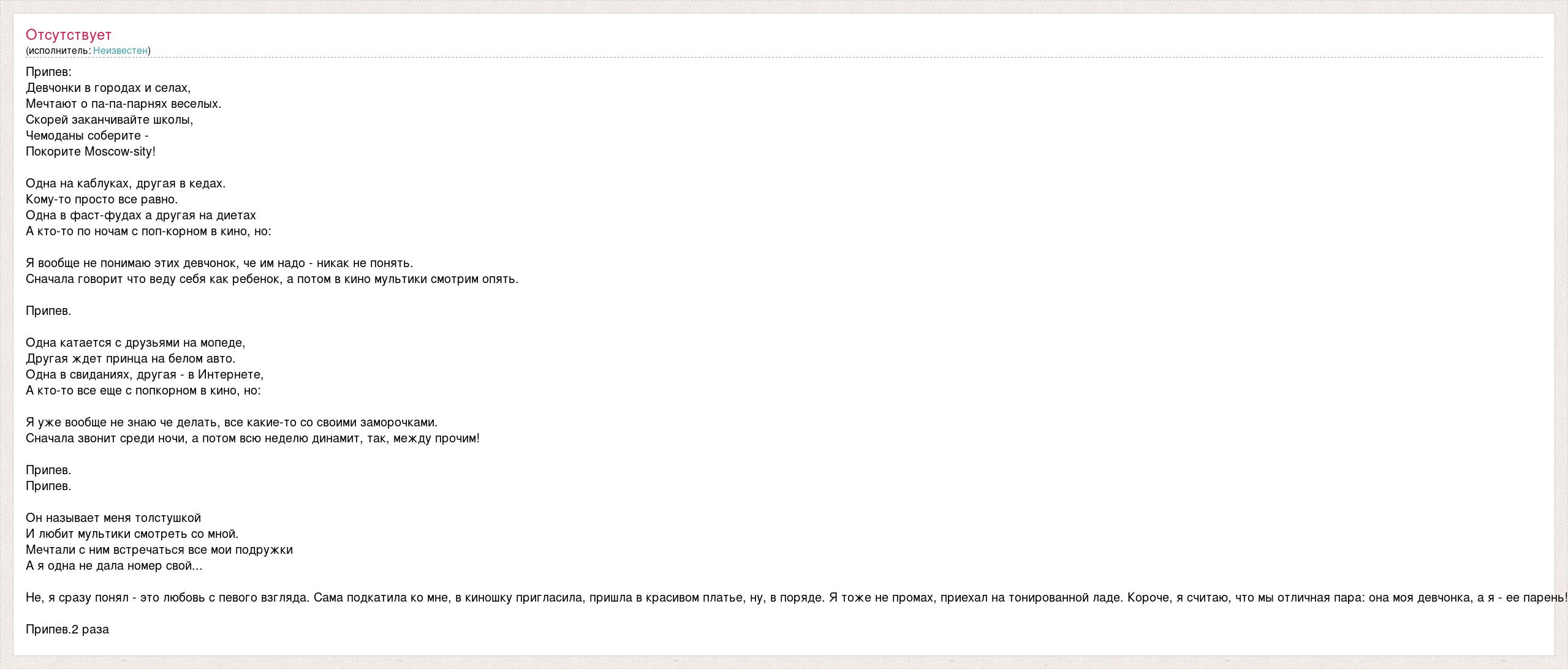 Припев: Девчонки в городах и селах, Мечтают о па-па-парнях веселых. Скорей заканчивайте школы, Чемоданы соберите - Покорите Moscow-sity! Одна на каблуках, другая в кедах. Кому-то просто все равно. Одна в фаст-фудах а другая на диетах А кто-то по ночам с поп-корном в кино, но: Я вообще не понимаю этих девчонок, че им надо - никак не понять. Сначала говорит что веду себя как ребенок, а потом в кино мультики смотрим опять. Припев. Одна катается с друзьями на мопеде, Другая ждет принца на белом авто. Одна в свиданиях, другая - в Интернете, А кто-то все еще с попкорном в кино, но: Я уже вообще не знаю че делать, все какие-то со своими заморочками. Сначала звонит среди ночи, а потом всю неделю динамит, так, между прочим! Припев. Припев. Он называет меня толстушкой И любит мультики смотреть со мной. Мечтали с ним встречаться все мои подружки А я одна не дала номер свой... Не, я сразу понял - это любовь с певого взгляда. Сама подкатила ко мне, в киношку пригласила, пришла в красивом платье, ну, в поряде. Я тоже не промах, приехал на тонированной ладе. Короче, я считаю, что мы отличная пара: она моя девчонка, а я - ее парень! Припев.2 раза