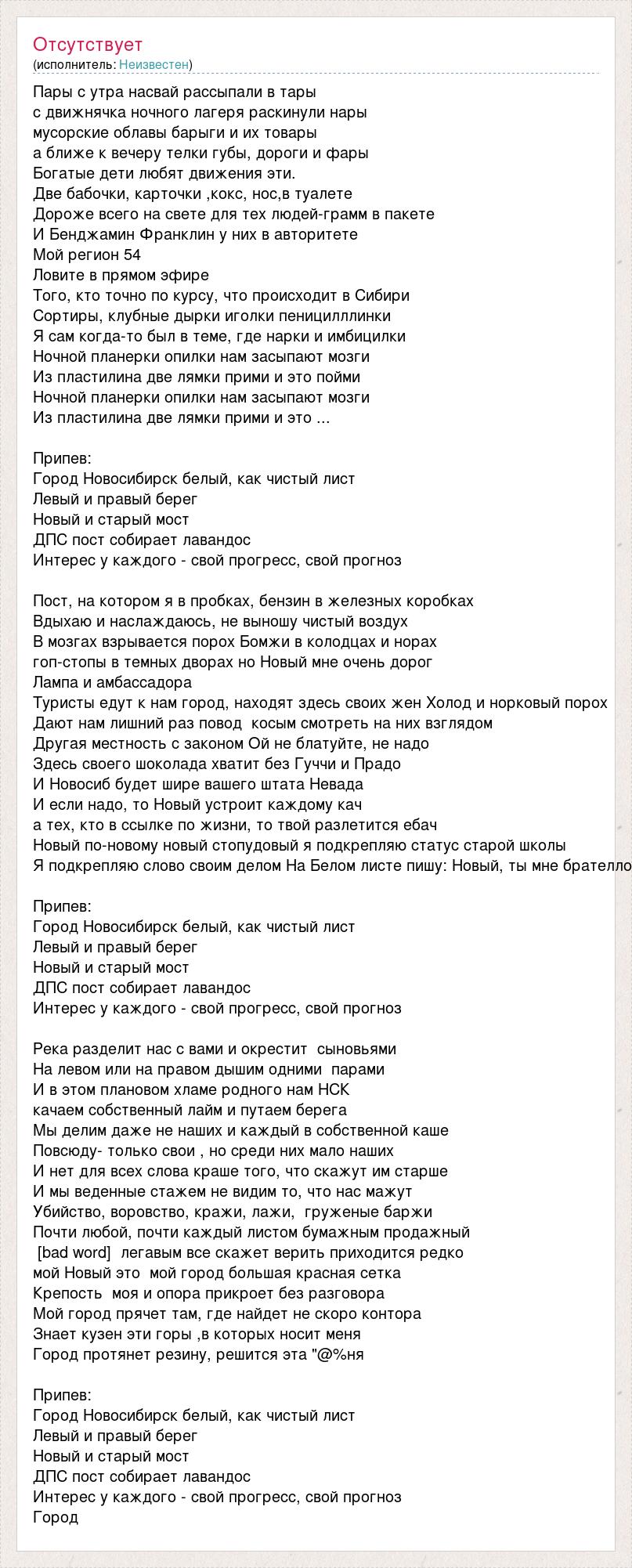 Пары с утра насвай рассыпали в тары с движнячка ночного лагеря раскинули нары мусорские облавы барыги и их товары а ближе к вечеру телки губы, дороги и фары Богатые дети любят движения эти. Две бабочки, карточки ,кокс, нос,в туалете Дороже всего на свете для тех людей-грамм в пакете И Бенджамин Франклин у них в авторитете Мой регион 54 Ловите в прямом эфире Того, кто точно по курсу, что происходит в Сибири Сортиры, клубные дырки иголки пеницилллинки Я сам когда-то был в теме, где нарки и имбицилки Ночной планерки опилки нам засыпают мозги Из пластилина две лямки прими и это пойми Ночной планерки опилки нам засыпают мозги Из пластилина две лямки прими и это ... Припев: Город Новосибирск белый, как чистый лист Левый и правый берег Новый и старый мост ДПС пост собирает лавандос Интерес у каждого - свой прогресс, свой прогноз Пост, на котором я в пробках, бензин в железных коробках Вдыхаю и наслаждаюсь, не выношу чистый воздух В мозгах взрывается порох Бомжи в колодцах и норах гоп-стопы в темных дворах но Новый мне очень дорог Лампа и амбассадора Туристы едут к нам город, находят здесь своих жен Холод и норковый порох Дают нам лишний раз повод косым смотреть на них взглядом Другая местность с законом Ой не блатуйте, не надо Здесь своего шоколада хватит без Гуччи и Прадо И Новосиб будет шире вашего штата Невада И если надо, то Новый устроит каждому кач а тех, кто в ссылке по жизни, то твой разлетится ебач Новый по-новому новый стопудовый я подкрепляю статус старой школы Я подкрепляю слово своим делом На Белом листе пишу: Новый, ты мне брателло Припев: Город Новосибирск белый, как чистый лист Левый и правый берег Новый и старый мост ДПС пост собирает лавандос Интерес у каждого - свой прогресс, свой прогноз Река разделит нас с вами и окрестит сыновьями На левом или на правом дышим одними парами И в этом плановом хламе родного нам НСК качаем собственный лайм и путаем берега Мы делим даже не наших и каждый в собственной каше Повсюду- только свои , но среди них мало наших И нет для всех слова краше того, что скажут им старше И мы веденные стажем не видим то, что нас мажут Убийство, воровство, кражи, лажи, груженые баржи Почти любой, почти каждый листом бумажным продажный [bad word] легавым все скажет верить приходится редко мой Новый это мой город большая красная сетка Крепость моя и опора прикроет без разговора Мой город прячет там, где найдет не скоро контора Знает кузен эти горы ,в которых носит меня Город протянет резину, решится эта "@%ня Припев: Город Новосибирск белый, как чистый лист Левый и правый берег Новый и старый мост ДПС пост собирает лавандос Интерес у каждого - свой прогресс, свой прогноз Город
