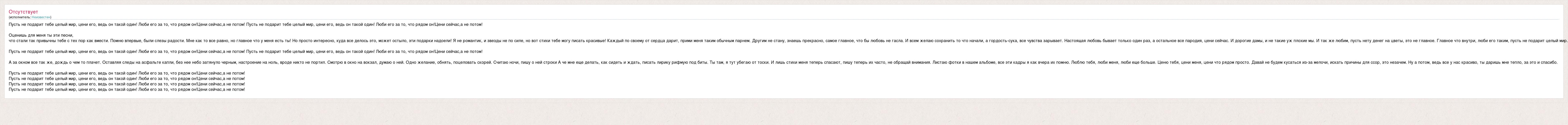 Пусть не подарит тебе целый мир, цени его, ведь он такой один! Люби его за то, что рядом он!Цени сейчас,а не потом! Пусть не подарит тебе целый мир, цени его, ведь он такой один! Люби его за то, что рядом он!Цени сейчас,а не потом! Оценишь для меня ты эти песни, что стали так привычны тебе с тех пор как вмести. Помню впервые, были слезы радости. Мне как то все равно, но главное что у меня есть ты! Но просто интересно, куда все делось это, может остыло, эти подарки надоели! Я не романтик, и звезды не по силе, но вот стихи тебе могу писать красивые! Каждый по своему от сердца дарит, прими меня таким обычным парнем. Другим не стану, знаешь прекрасно, самое главное, что бы любовь не гасла. И всем желаю сохранить то что начали, а гордость-сука, все чувства зарывает. Настоящая любовь бывает только один раз, а остальное все пародия, цени сейчас. И дорогие дамы, и не такие уж плохие мы. И так же любим, пусть нету денег на цветы, это не главное. Главное что внутри, люби его таким, пусть не подарит целый мир. Пусть не подарит тебе целый мир, цени его, ведь он такой один! Люби его за то, что рядом он!Цени сейчас,а не потом! Пусть не подарит тебе целый мир, цени его, ведь он такой один! Люби его за то, что рядом он!Цени сейчас,а не потом! А за окном все так же, дождь о чем то плачет. Оставляя следы на асфальте капли, без нее небо затянуло черным, настроение на ноль, вроде никто не портил. Смотрю в окно на вокзал, думаю о ней. Одно желание, обнять, поцеловать скорей. Считаю ночи, пишу о ней строки А че мне еще делать, как сидеть и ждать, писать лирику рифмую под биты. Ты там, я тут убегаю от тоски. И лишь стихи меня теперь спасают, пишу теперь их часто, не обращай внимания. Листаю фотки в нашем альбоме, все эти кадры я как вчера их помню. Люблю тебя, люби меня, люби еще больше. Ценю тебя, цени меня, цени что рядом просто. Давай не будем кусаться из-за мелочи, искать причины для ссор, это незачем. Ну а потом, ведь все у нас красиво, ты даришь мне тепло, за это и спасибо. Пусть не подарит тебе целый мир, цени его, ведь он такой один! Люби его за то, что рядом он!Цени сейчас,а не потом! Пусть не подарит тебе целый мир, цени его, ведь он такой один! Люби его за то, что рядом он!Цени сейчас,а не потом! Пусть не подарит тебе целый мир, цени его, ведь он такой один! Люби его за то, что рядом он!Цени сейчас,а не потом! Пусть не подарит тебе целый мир, цени его, ведь он такой один! Люби его за то, что рядом он!Цени сейчас,а не потом!
