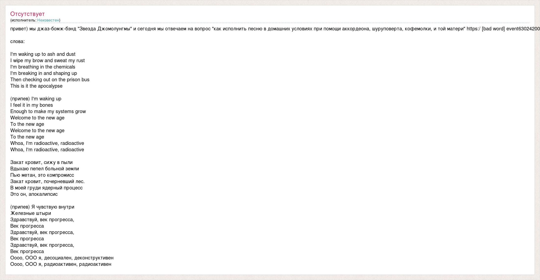 привет) мы джаз-бомж-бэнд "Звезда Джомолунгмы" и сегодня мы отвечаем на вопрос "как исполнить песню в домашних условиях при помощи аккордеона, шуруповерта, кофемолки, и той матери" https:/ [bad word] event63024200 слова: I'm waking up to ash and dust I wipe my brow and sweat my rust I'm breathing in the chemicals I'm breaking in and shaping up Then checking out on the prison bus This is it the apocalypse (припев) I'm waking up I feel it in my bones Enough to make my systems grow Welcome to the new age To the new age Welcome to the new age To the new age Whoa, I'm radioactive, radioactive Whoa, I'm radioactive, radioactive Закат кровит, сижу в пыли Вдыхаю пепел больной земли Пью метан, это компромисс Закат кровит, почерневший лес. В моей груди ядерный процесс Это он, апокалипсис (припев) Я чувствую внутри Железные штыри Здравствуй, век прогресса, Век прогресса Здравствуй, век прогресса, Век прогресса Здравствуй, век прогресса, Век прогресса Оооо, ООО я, десоциален, деконструктивен Оооо, ООО я, радиоактивен, радиоактивен