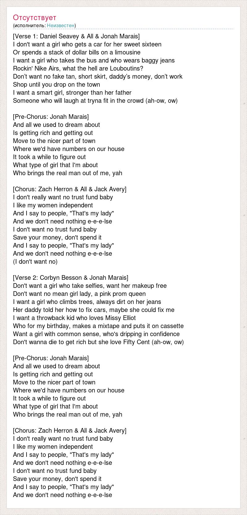[Verse 1: Daniel Seavey & All & Jonah Marais] I don't want a girl who gets a car for her sweet sixteen Or spends a stack of dollar bills on a limousine I want a girl who takes the bus and who wears baggy jeans Rockin' Nike Airs, what the hell are Louboutins? Don’t want no fake tan, short skirt, daddy’s money, don’t work Shop until you drop on the town I want a smart girl, stronger than her father Someone who will laugh at tryna fit in the crowd (ah-ow, ow) [Pre-Chorus: Jonah Marais] And all we used to dream about Is getting rich and getting out Move to the nicer part of town Where we'd have numbers on our house It took a while to figure out What type of girl that I'm about Who brings the real man out of me, yah [Chorus: Zach Herron & All & Jack Avery] I don't really want no trust fund baby I like my women independent And I say to people, "That's my lady" And we don't need nothing e-e-e-lse I don't want no trust fund baby Save your money, don't spend it And I say to people, "That's my lady" And we don't need nothing e-e-e-lse (I don't want no) [Verse 2: Corbyn Besson & Jonah Marais] Don't want a girl who take selfies, want her makeup free Don't want no mean girl lady, a pink prom queen I want a girl who climbs trees, always dirt on her jeans Her daddy told her how to fix cars, maybe she could fix me I want a throwback kid who loves Missy Elliot Who for my birthday, makes a mixtape and puts it on cassette Want a girl with common sense, who's dripping in confidence Don't wanna die to get rich but she love Fifty Cent (ah-ow, ow) [Pre-Chorus: Jonah Marais] And all we used to dream about Is getting rich and getting out Move to the nicer part of town Where we'd have numbers on our house It took a while to figure out What type of girl that I'm about Who brings the real man out of me, yah [Chorus: Zach Herron & All & Jack Avery] I don't really want no trust fund baby I like my women independent And I say to people, "That's my lady" And we don't need nothing e-e-e-lse I don't want no trust fund baby Save your money, don't spend it And I say to people, "That's my lady" And we don't need nothing e-e-e-lse