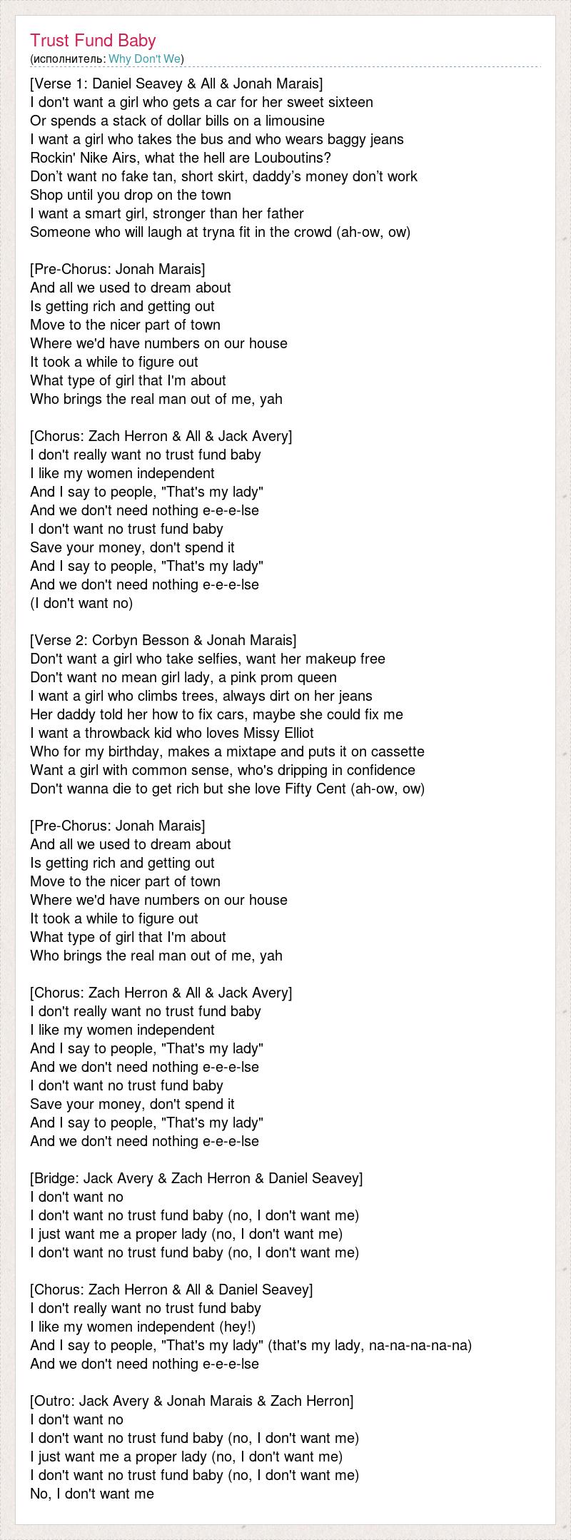 [Verse 1: Daniel Seavey & All & Jonah Marais] I don't want a girl who gets a car for her sweet sixteen Or spends a stack of dollar bills on a limousine I want a girl who takes the bus and who wears baggy jeans Rockin' Nike Airs, what the hell are Louboutins? Don’t want no fake tan, short skirt, daddy’s money don’t work Shop until you drop on the town I want a smart girl, stronger than her father Someone who will laugh at tryna fit in the crowd (ah-ow, ow) [Pre-Chorus: Jonah Marais] And all we used to dream about Is getting rich and getting out Move to the nicer part of town Where we'd have numbers on our house It took a while to figure out What type of girl that I'm about Who brings the real man out of me, yah [Chorus: Zach Herron & All & Jack Avery] I don't really want no trust fund baby I like my women independent And I say to people, "That's my lady" And we don't need nothing e-e-e-lse I don't want no trust fund baby Save your money, don't spend it And I say to people, "That's my lady" And we don't need nothing e-e-e-lse (I don't want no) [Verse 2: Corbyn Besson & Jonah Marais] Don't want a girl who take selfies, want her makeup free Don't want no mean girl lady, a pink prom queen I want a girl who climbs trees, always dirt on her jeans Her daddy told her how to fix cars, maybe she could fix me I want a throwback kid who loves Missy Elliot Who for my birthday, makes a mixtape and puts it on cassette Want a girl with common sense, who's dripping in confidence Don't wanna die to get rich but she love Fifty Cent (ah-ow, ow) [Pre-Chorus: Jonah Marais] And all we used to dream about Is getting rich and getting out Move to the nicer part of town Where we'd have numbers on our house It took a while to figure out What type of girl that I'm about Who brings the real man out of me, yah [Chorus: Zach Herron & All & Jack Avery] I don't really want no trust fund baby I like my women independent And I say to people, "That's my lady" And we don't need nothing e-e-e-lse I don't want no trust fund baby Save your money, don't spend it And I say to people, "That's my lady" And we don't need nothing e-e-e-lse [Bridge: Jack Avery & Zach Herron & Daniel Seavey] I don't want no I don't want no trust fund baby (no, I don't want me) I just want me a proper lady (no, I don't want me) I don't want no trust fund baby (no, I don't want me) [Chorus: Zach Herron & All & Daniel Seavey] I don't really want no trust fund baby I like my women independent (hey!) And I say to people, "That's my lady" (that's my lady, na-na-na-na-na) And we don't need nothing e-e-e-lse [Outro: Jack Avery & Jonah Marais & Zach Herron] I don't want no I don't want no trust fund baby (no, I don't want me) I just want me a proper lady (no, I don't want me) I don't want no trust fund baby (no, I don't want me) No, I don't want me