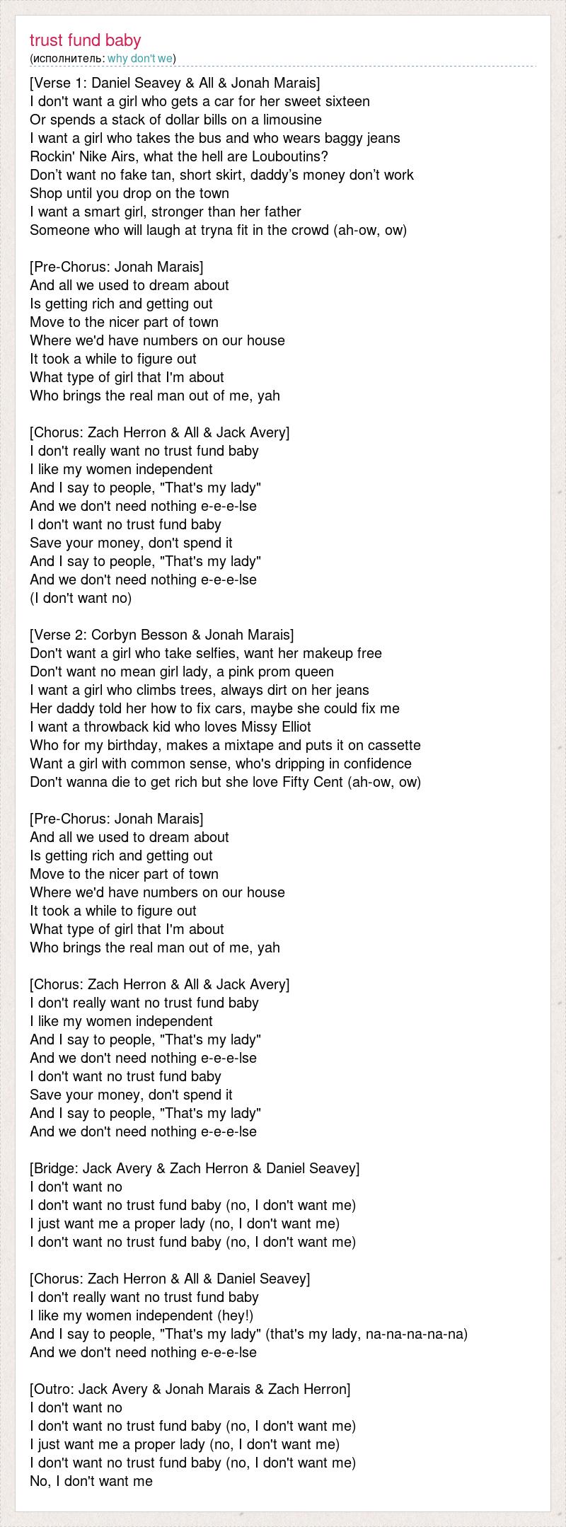 [Verse 1: Daniel Seavey & All & Jonah Marais] I don't want a girl who gets a car for her sweet sixteen Or spends a stack of dollar bills on a limousine I want a girl who takes the bus and who wears baggy jeans Rockin' Nike Airs, what the hell are Louboutins? Don’t want no fake tan, short skirt, daddy’s money don’t work Shop until you drop on the town I want a smart girl, stronger than her father Someone who will laugh at tryna fit in the crowd (ah-ow, ow) [Pre-Chorus: Jonah Marais] And all we used to dream about Is getting rich and getting out Move to the nicer part of town Where we'd have numbers on our house It took a while to figure out What type of girl that I'm about Who brings the real man out of me, yah [Chorus: Zach Herron & All & Jack Avery] I don't really want no trust fund baby I like my women independent And I say to people, "That's my lady" And we don't need nothing e-e-e-lse I don't want no trust fund baby Save your money, don't spend it And I say to people, "That's my lady" And we don't need nothing e-e-e-lse (I don't want no) [Verse 2: Corbyn Besson & Jonah Marais] Don't want a girl who take selfies, want her makeup free Don't want no mean girl lady, a pink prom queen I want a girl who climbs trees, always dirt on her jeans Her daddy told her how to fix cars, maybe she could fix me I want a throwback kid who loves Missy Elliot Who for my birthday, makes a mixtape and puts it on cassette Want a girl with common sense, who's dripping in confidence Don't wanna die to get rich but she love Fifty Cent (ah-ow, ow) [Pre-Chorus: Jonah Marais] And all we used to dream about Is getting rich and getting out Move to the nicer part of town Where we'd have numbers on our house It took a while to figure out What type of girl that I'm about Who brings the real man out of me, yah [Chorus: Zach Herron & All & Jack Avery] I don't really want no trust fund baby I like my women independent And I say to people, "That's my lady" And we don't need nothing e-e-e-lse I don't want no trust fund baby Save your money, don't spend it And I say to people, "That's my lady" And we don't need nothing e-e-e-lse [Bridge: Jack Avery & Zach Herron & Daniel Seavey] I don't want no I don't want no trust fund baby (no, I don't want me) I just want me a proper lady (no, I don't want me) I don't want no trust fund baby (no, I don't want me) [Chorus: Zach Herron & All & Daniel Seavey] I don't really want no trust fund baby I like my women independent (hey!) And I say to people, "That's my lady" (that's my lady, na-na-na-na-na) And we don't need nothing e-e-e-lse [Outro: Jack Avery & Jonah Marais & Zach Herron] I don't want no I don't want no trust fund baby (no, I don't want me) I just want me a proper lady (no, I don't want me) I don't want no trust fund baby (no, I don't want me) No, I don't want me
