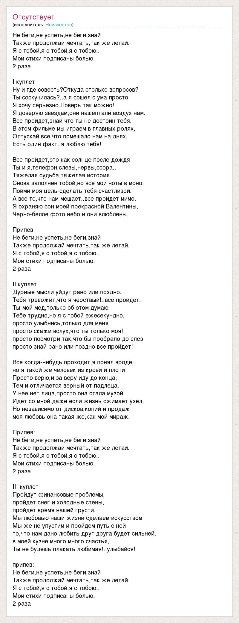 Не беги,не успеть,не беги,знай Также продолжай мечтать,так же летай. Я с тобой,я с тобой,я с тобою.. Мои стихи подписаны болью. 2 раза I куплет Ну и где совесть?Откуда столько вопросов? Ты соскучилась?..а я сошел с ума просто Я хочу серьезно.Поверь так можно! Я доверяю звездам,они нашептали воздух нам. Все пройдет,знай что ты не достоин тебя. В этом фильме мы играем в главных ролях, Отпускай все,что помешало нам на днях. Есть один факт..я люблю тебя! Все пройдет,это как солнце после дождя Ты и я,телефон,слезы,нервы,ссора.. Тяжелая судьба,тяжелая история. Снова заполнен тобой,но все мои ноты в моно. Пойми моя цель-сделать тебя счастливой. А все то,что нам мешает..все пройдет мимо. Я охраняю сон моей прекрасной Валентины, Черно-белое фото,небо и они влюблены. Припев Не беги,не успеть,не беги,знай Также продолжай мечтать,так же летай. Я с тобой,я с тобой,я с тобою.. Мои стихи подписаны болью. 2 раза II куплет Дурные мысли уйдут рано или поздно. Тебя тревожит,что я черствый!..все пройдет. Ты-мой мед,только об этом думаю Тебе трудно,но я с тобой ежесекундно. просто улыбнись,только для меня просто скажи вслух,что ты только моя! просто посмотри так,что бы пробрало до слез просто знай рано или поздно все пройдет! Все когда-нибудь проходит,я понял вроде, но я такой же человек из крови и плоти Просто верю,и за веру иду до конца, Тем и отличается верный от падлеца. У нее нет лица,просто она стала музой. Идет со мной,даже если жизнь сжимает узел, Но независимо от дисков,копий и продаж моя любовь она такая же,как мой мираж. Припев: Не беги,не успеть,не беги,знай Также продолжай мечтать,так же летай. Я с тобой,я с тобой,я с тобою.. Мои стихи подписаны болью. 2 раза III куплет Пройдут финансовые проблемы, пройдет снег и холодные стены, пройдет время нашей грусти. Мы любовью наши жизни сделаем искусством Мы же не упустим и пройдем путь с ней то,что нам дано любить друг друга будет сильней. в моей кузне много много счастья, Ты не будешь плакать любимая!..улыбайся! припев: Не беги,не успеть,не беги,знай Также продолжай мечтать,так же летай. Я с тобой,я с тобой,я с тобою.. Мои стихи подписаны болью. 2 раза