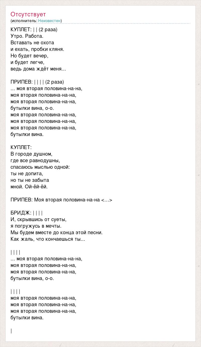 КУПЛЕТ: | | (2 раза) Утро. Работа. Вставать не охота и ехать, пробки кляня. Но будет вечер, и будет легче, ведь дома ждёт меня... ПРИПЕВ: | | | | (2 раза) ... моя вторая половина-на-на, моя вторая половина-на-на, моя вторая половина-на-на, бутылки вина, о-о. моя вторая половина-на-на, моя вторая половина-на-на, моя вторая половина-на-на, бутылки вина. КУПЛЕТ: В городе душном, где все равнодушны, спасаюсь мыслью одной: ты не допита, но ты не забыта мной. Ой-ёй-ёй. ПРИПЕВ: Моя вторая половина-на-на <…> БРИДЖ: | | | | И, скрывшись от суеты, я погружусь в мечты. Мы будем вместе до конца этой песни. Как жаль, что кончаешься ты... | | | | ... моя вторая половина-на-на, моя вторая половина-на-на, моя вторая половина-на-на, бутылки вина, о-о. | | | | моя вторая половина-на-на, моя вторая половина-на-на, моя вторая половина-на-на, бутылки вина. |